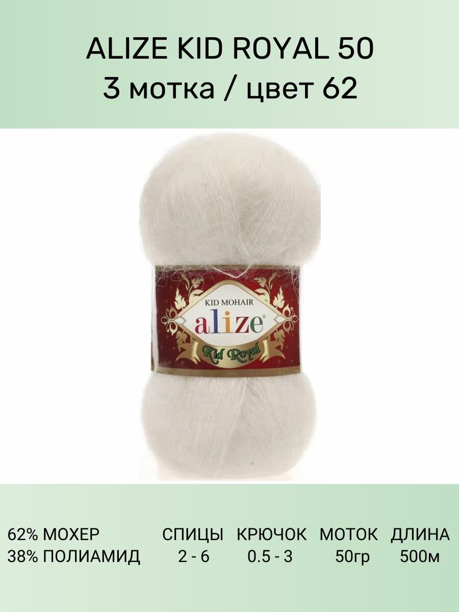 Пряжа Alize Kid Royal 50 кремовый (62), 62%кид мохер/38%полиамид, 500м, 50г, 3шт информация:
