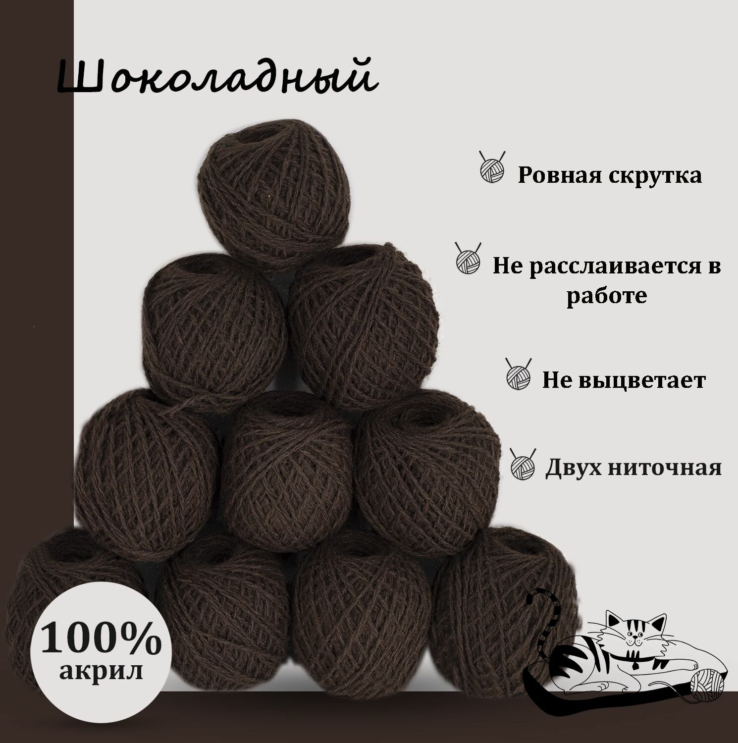 Пряжа для ручного вязания в клубочках. Набор 10 штук. Моток 40 грамм / 70 метров. Шоколадный информация: