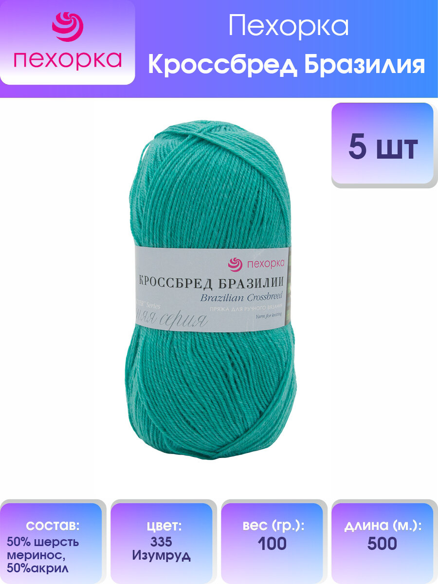 Пряжа для вязания Пехорка 'Кроссбред Бразилии', 100 г, 500 м (50% шерсть мериносовая, 50% акрил) (335 Изумруд), 5 мотков информация: