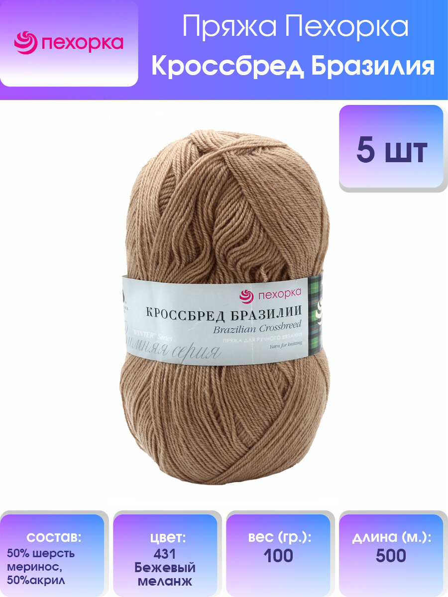 10 цен на Пряжа для вязания Пехорка 'Кроссбред Бразилии', 100 г, 500 м (50% шерсть мериносовая, 50% акрил) (431 Бежевый меланж), 5 мотков