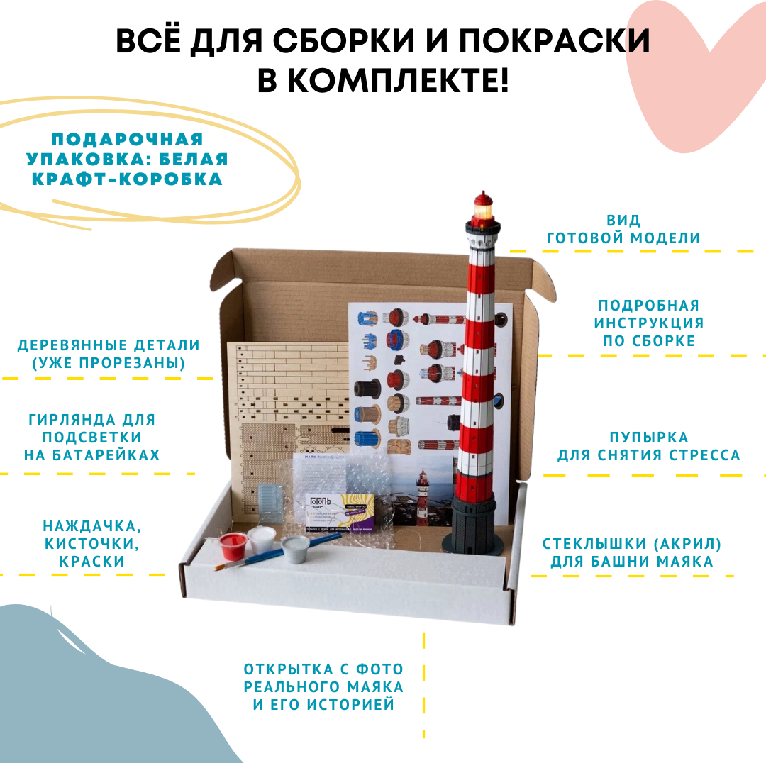 | Комплектация | деревянные детали для сборки (уже прорезаны) стёклышки для верхушки маяка (оргстекло) акриловая краска необходимых оттенков 2 кисти 2 электро-свечи на батарейках (в комплекте) наждачка 3d-инструкция по сборке и рекомендации по покраске открытка с фото реального маяка (и историческая справка об этом маяке на обороте) |