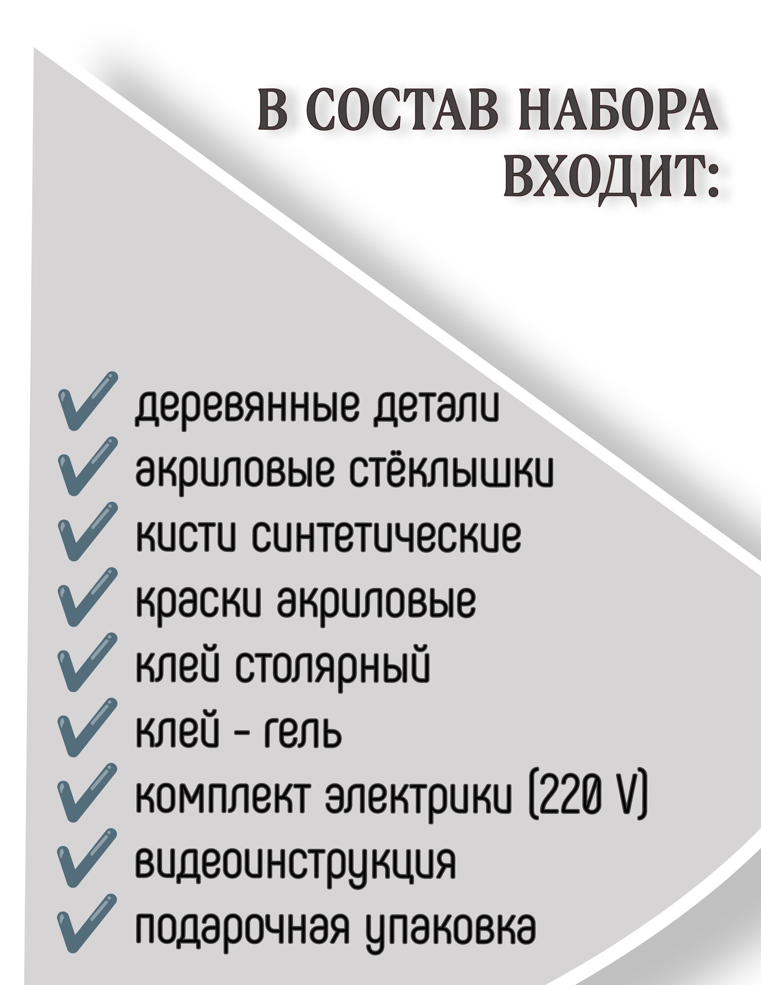 | Комплектация | Деревянные детали / комплект акриловых стёклышек / краски / кисти / клей / комплект электрики для работы от сети |