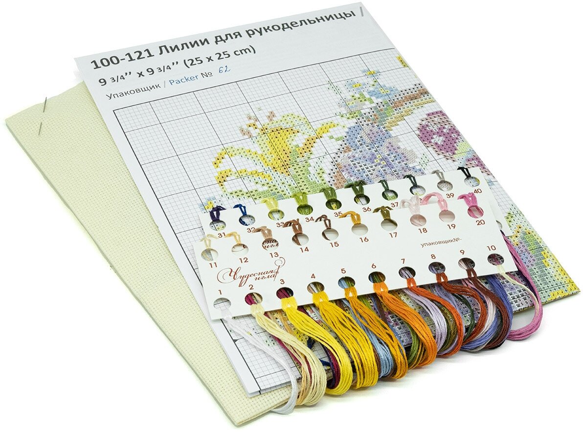| Комплектация | В набор входит: Цветная легкочитаемая схема, канва Аида 14 цв. кремовая, хлопковое мулине "Gamma" на органайзере, подробная инструкция, игла для вышивания. |