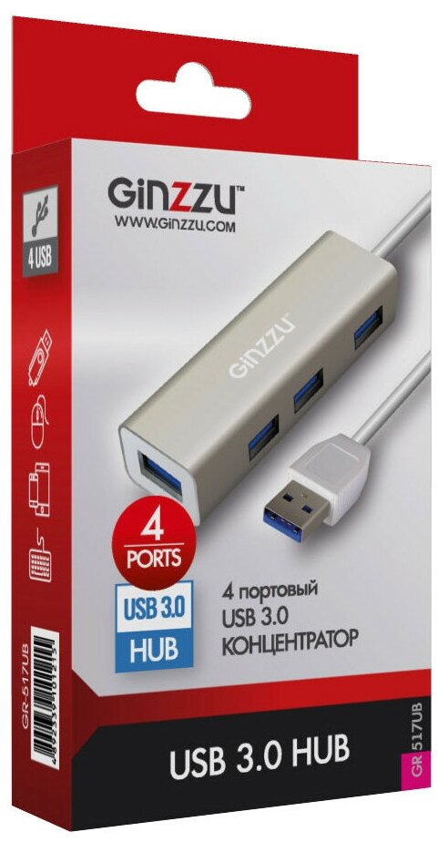 Разветвитель USB GiNZZU Gr-517ub (4 порта USB 3.0, кабель 20 см) серебристый