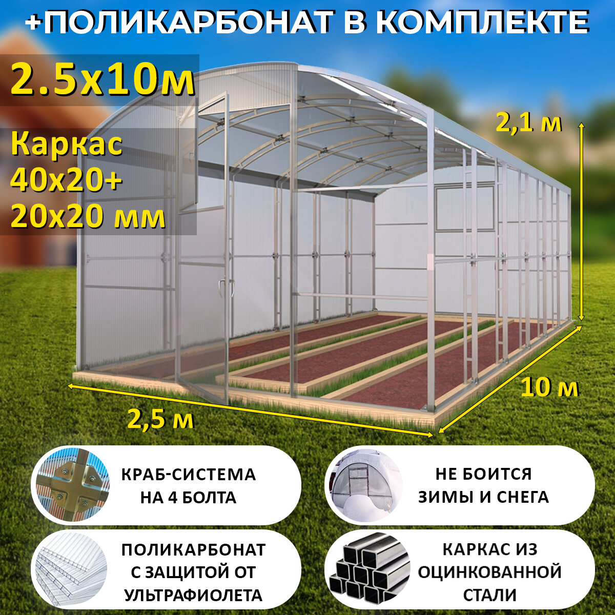 10 цен на Теплица Прямостенная (Поликарбонат в комплекте) 2.5 х 10 метров, оцинкованный каркас 40х20+20x20 мм - Царская Премиум