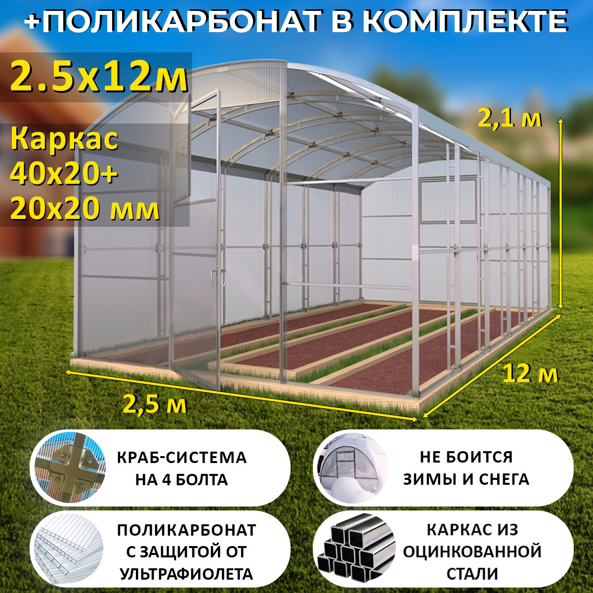 10 цен на Теплица Прямостенная (Поликарбонат в комплекте) 2.5 х 12 метров, оцинкованный каркас 40х20+20x20 мм - Царская Премиум