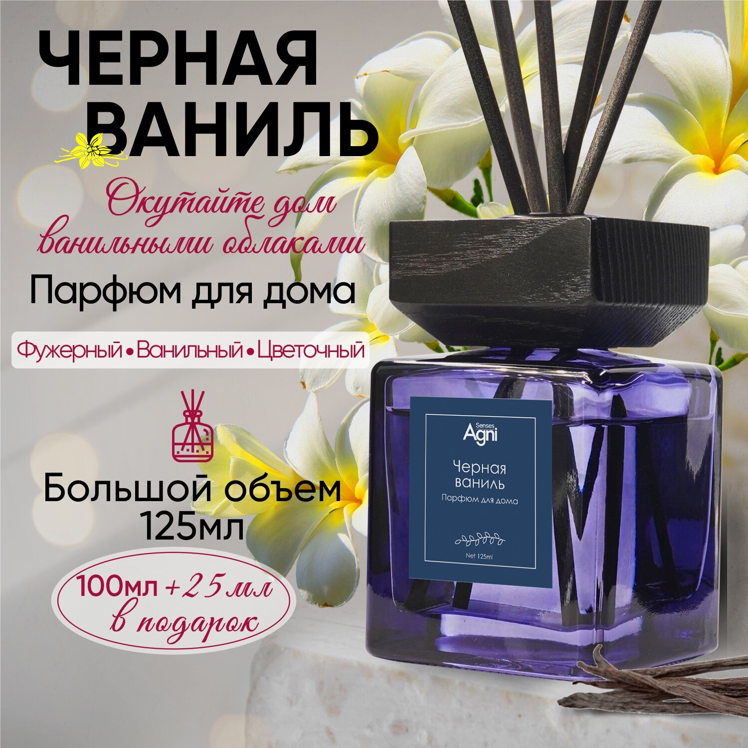 Аромадиффузор "Черная ваниль", 125 мл, AGNI Senses. Ароматизатор для дома на натуральных эфирных маслах, с 6 фибровыми палочками информация: