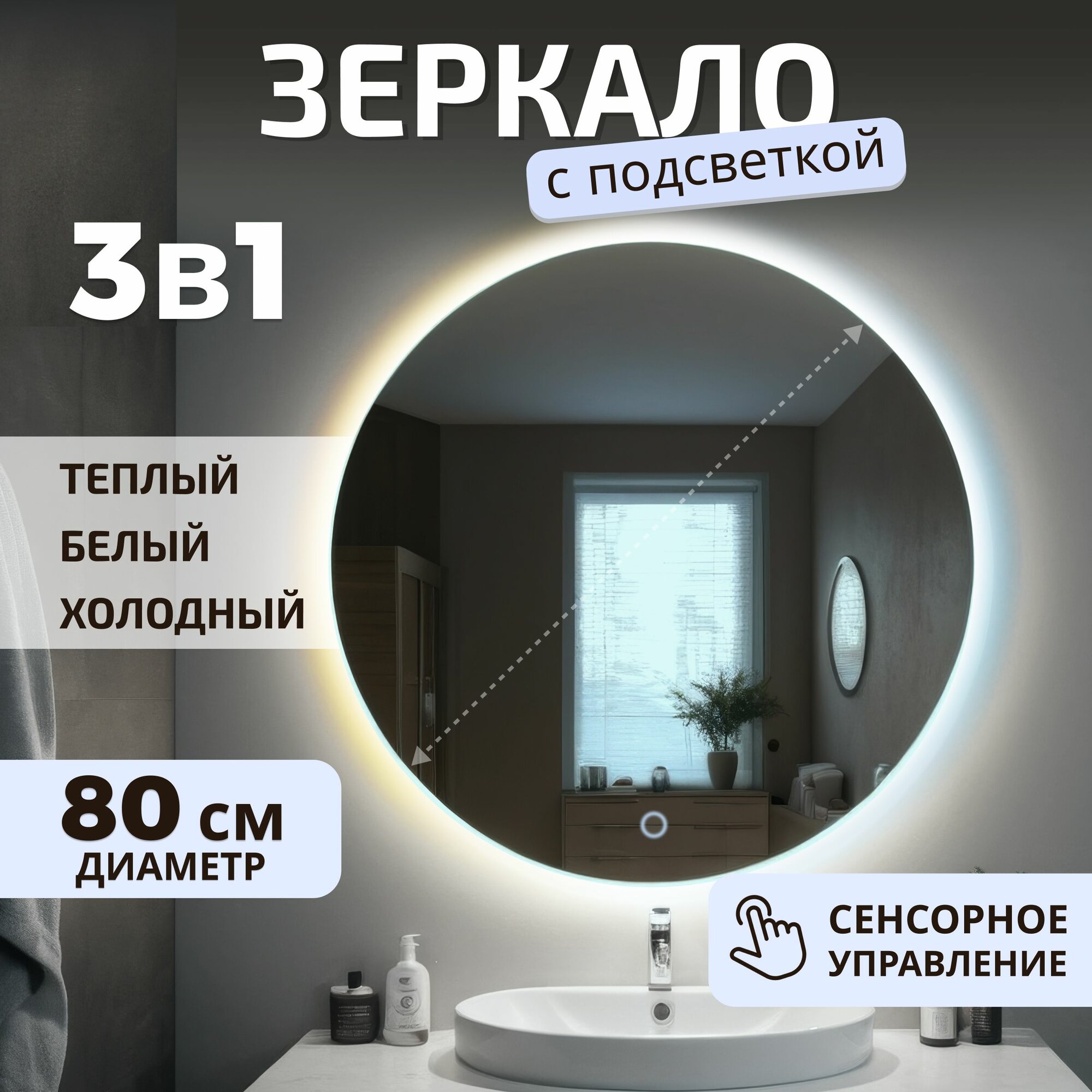 Настенное зеркало с подсветкой в ванную прихожую круглое сенсорный выключатель 3000К 80 см 5 412 ₽