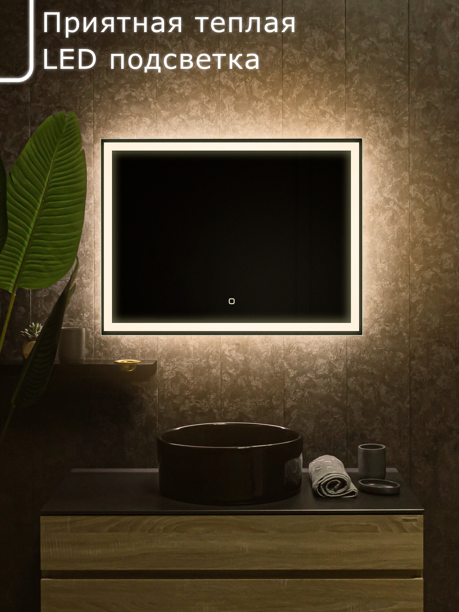 Зеркало с LED подсветкой OBERIAL 80x60см (тёплый свет 3000К, прямоугольное настенное для ванной сенсорное выключение) информация:
