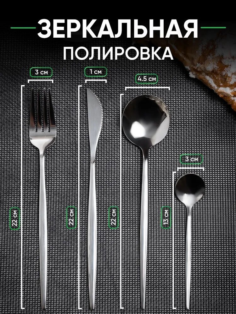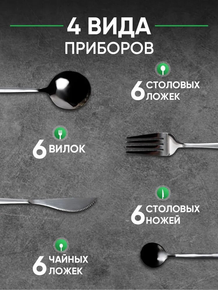 | В набор входит | 24 столовых прибора, из них 6 столовых ложек, 6 столовых ножей, 6 вилок, 6 чайных ложек |