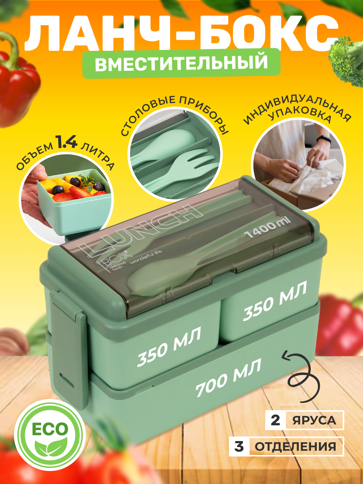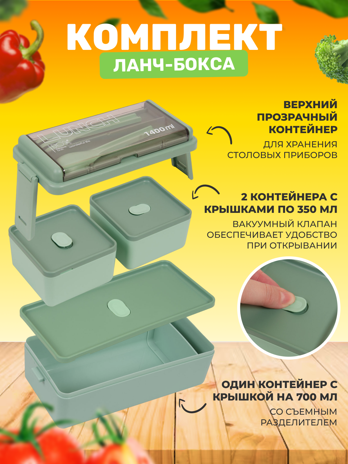 Ланч-бокс отделениями и приборами, 1,4 л, зеленый информация: