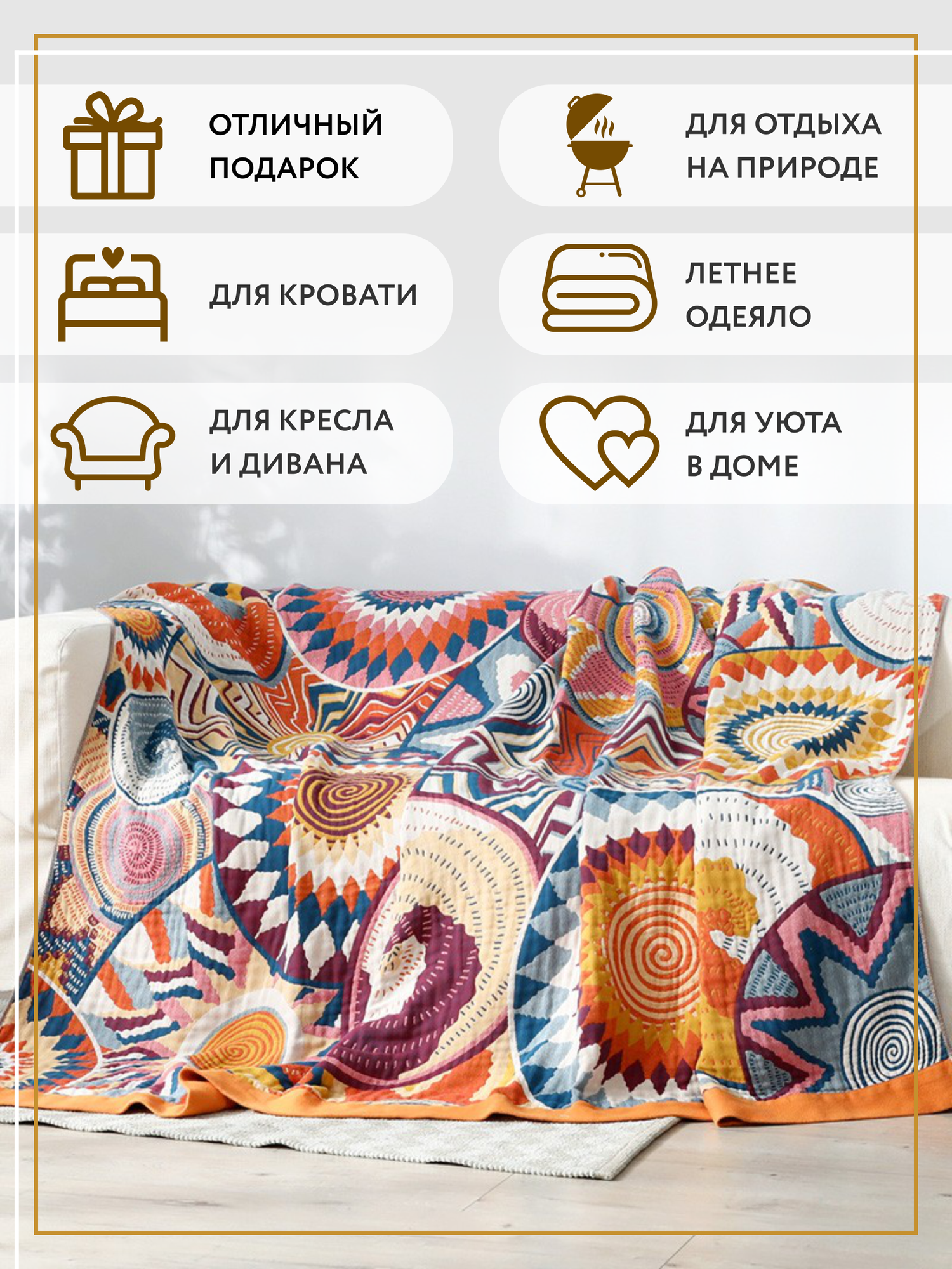 Отзывы на Покрывало на кровать Sundelica Плед 150х200 "Солнечный орнамент" Хлопок Муслиновое одеяло