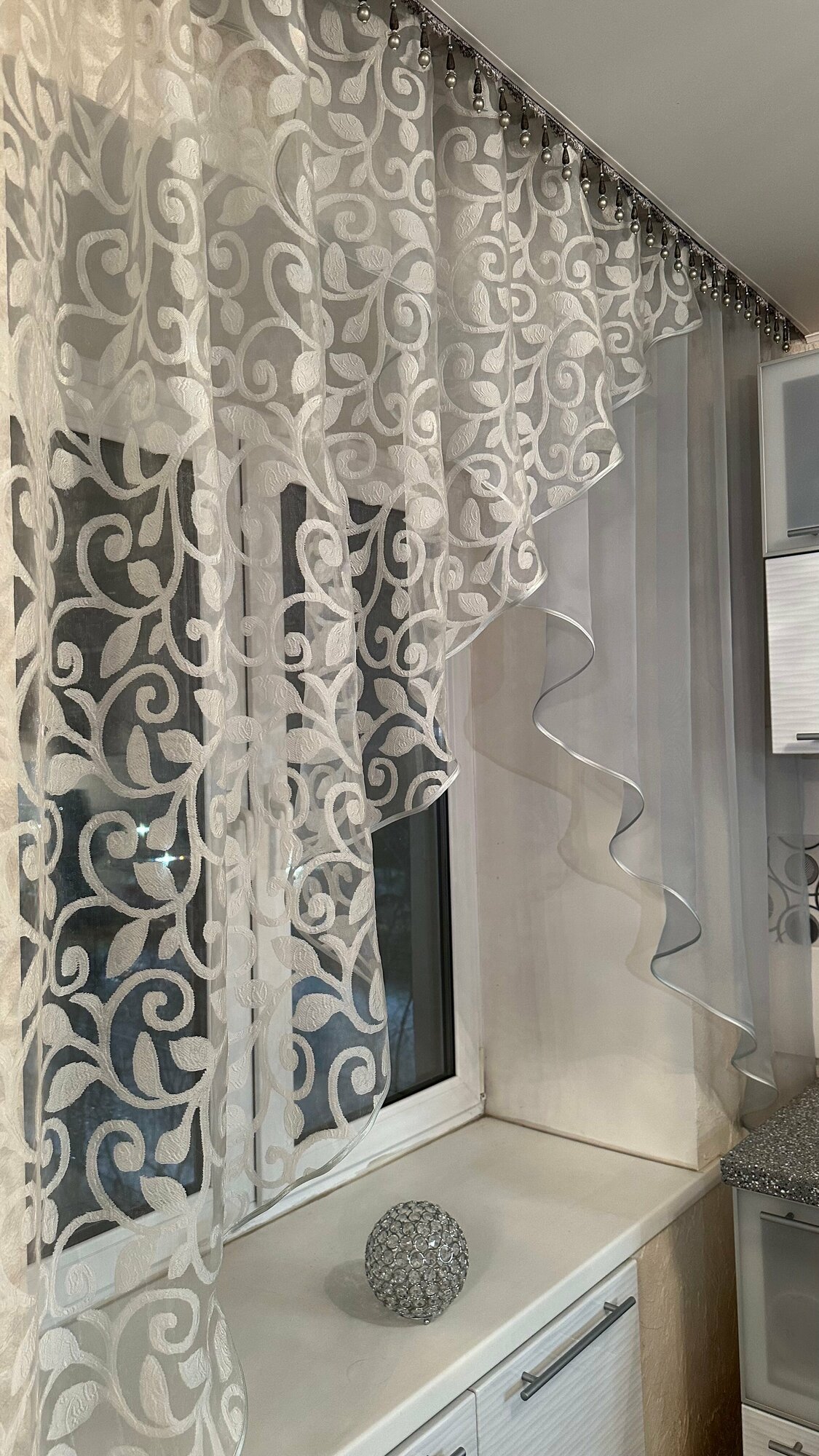 Отзывы на Кухонная шторка кремовый вензель с серым, ширина 3м, высота 1,7м
