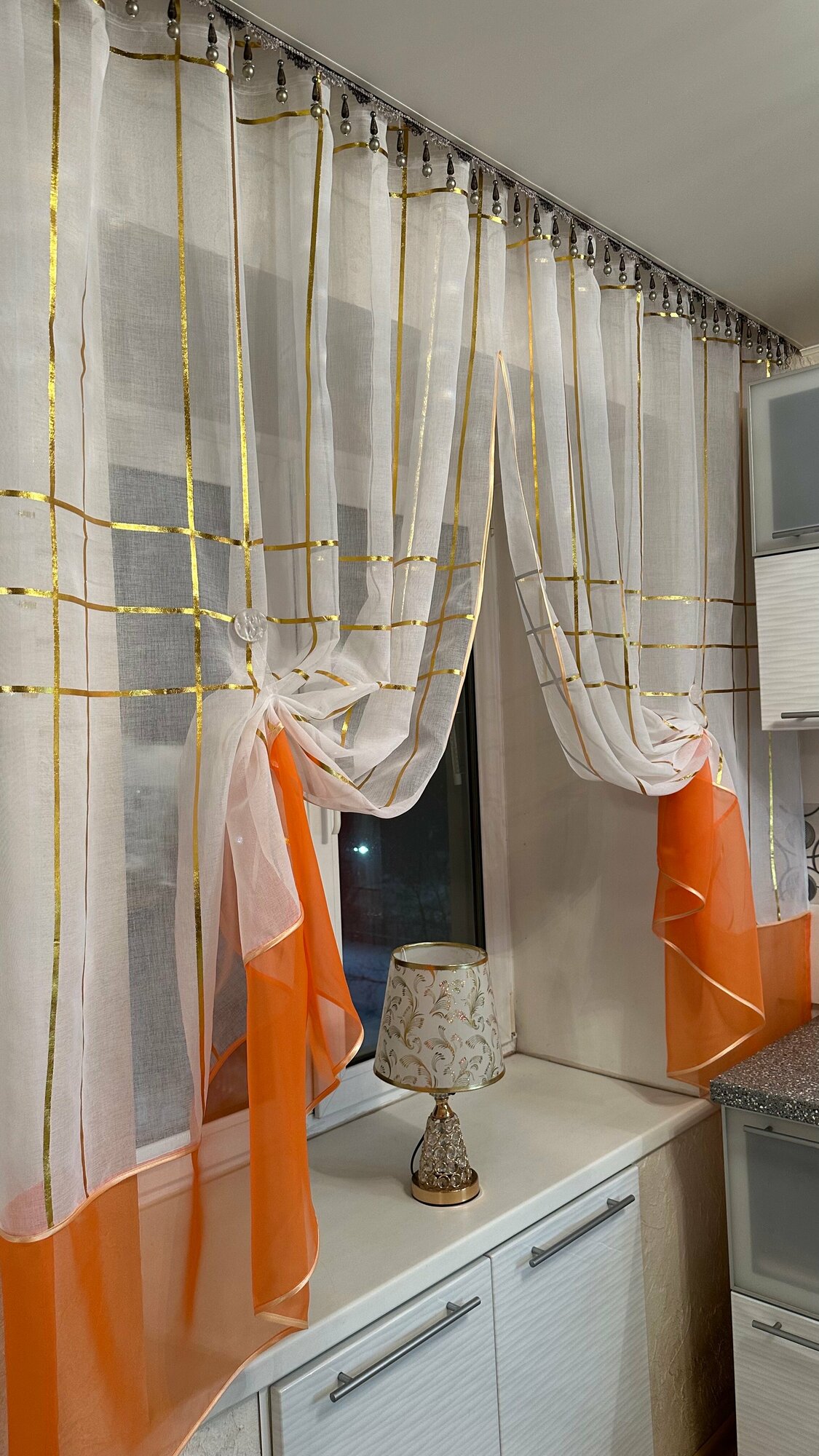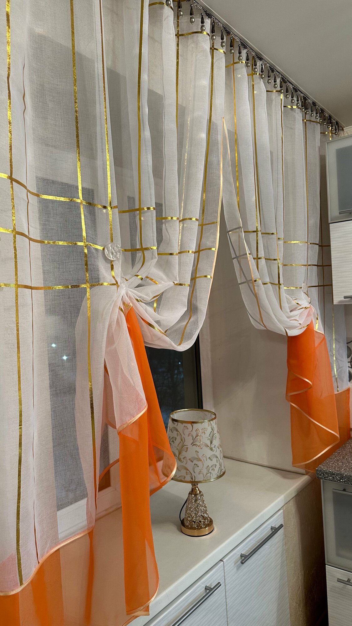 Отзывы на Кухонная шторка льняная с золотом и оранжевой вставкой, ширина 3м, высота 1,7м