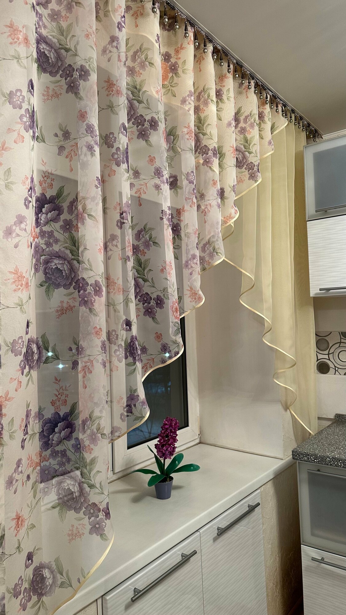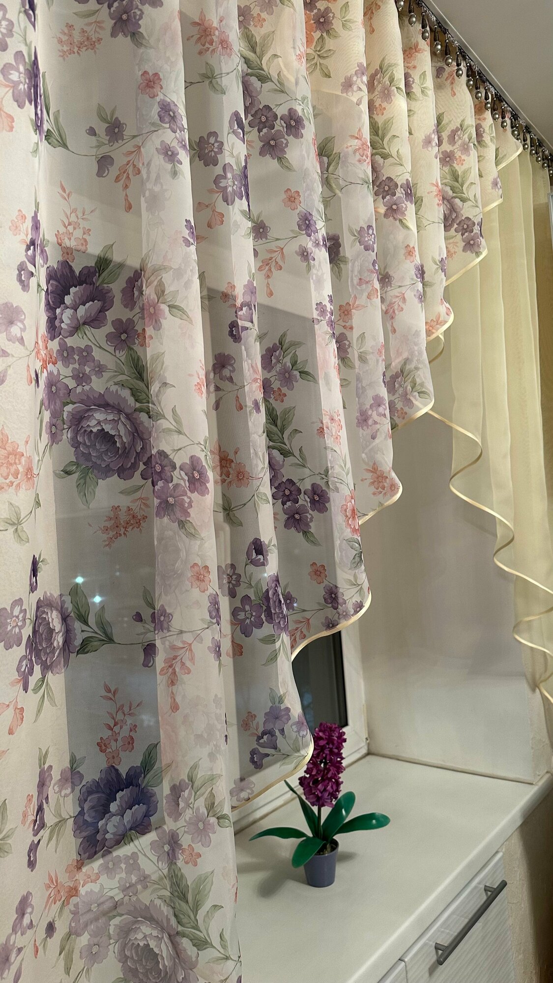 Отзывы на Кухонная шторка цветы сиреневые с светло- бежевым, ширина 3м, высота 1,7м