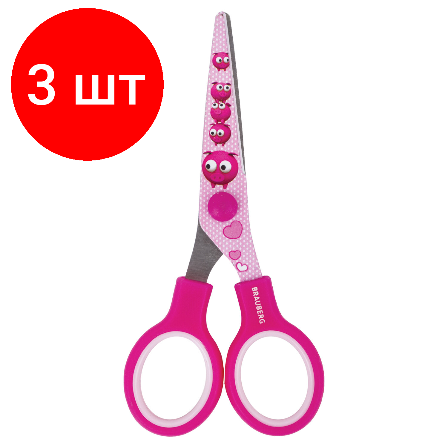 Комплект 3 шт, Ножницы BRAUBERG "Kid Series", 130 мм, розовые, с цветной печатью "Поросята", закругленные, 232272 информация: