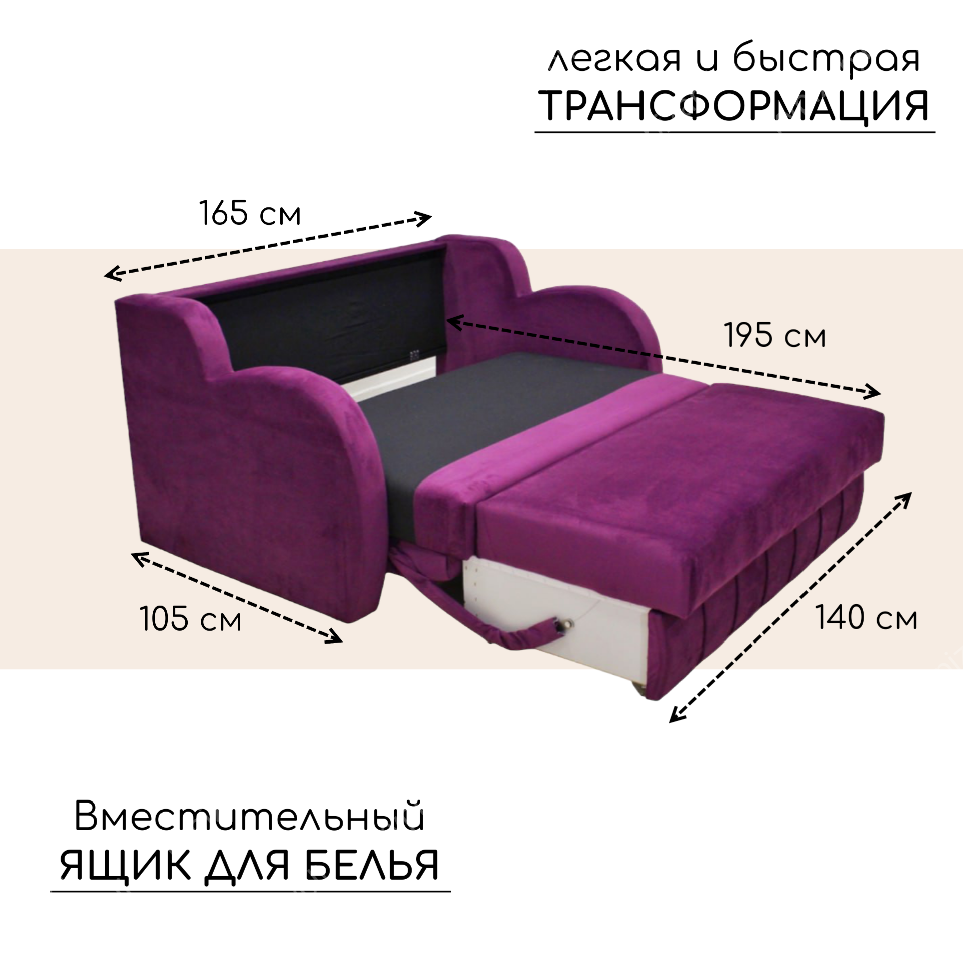 Выкатной диван-кровать прямой Роял Люкс фиолетовый с ящиком для хранения (сп.м. 140 см х 195 см) информация:
