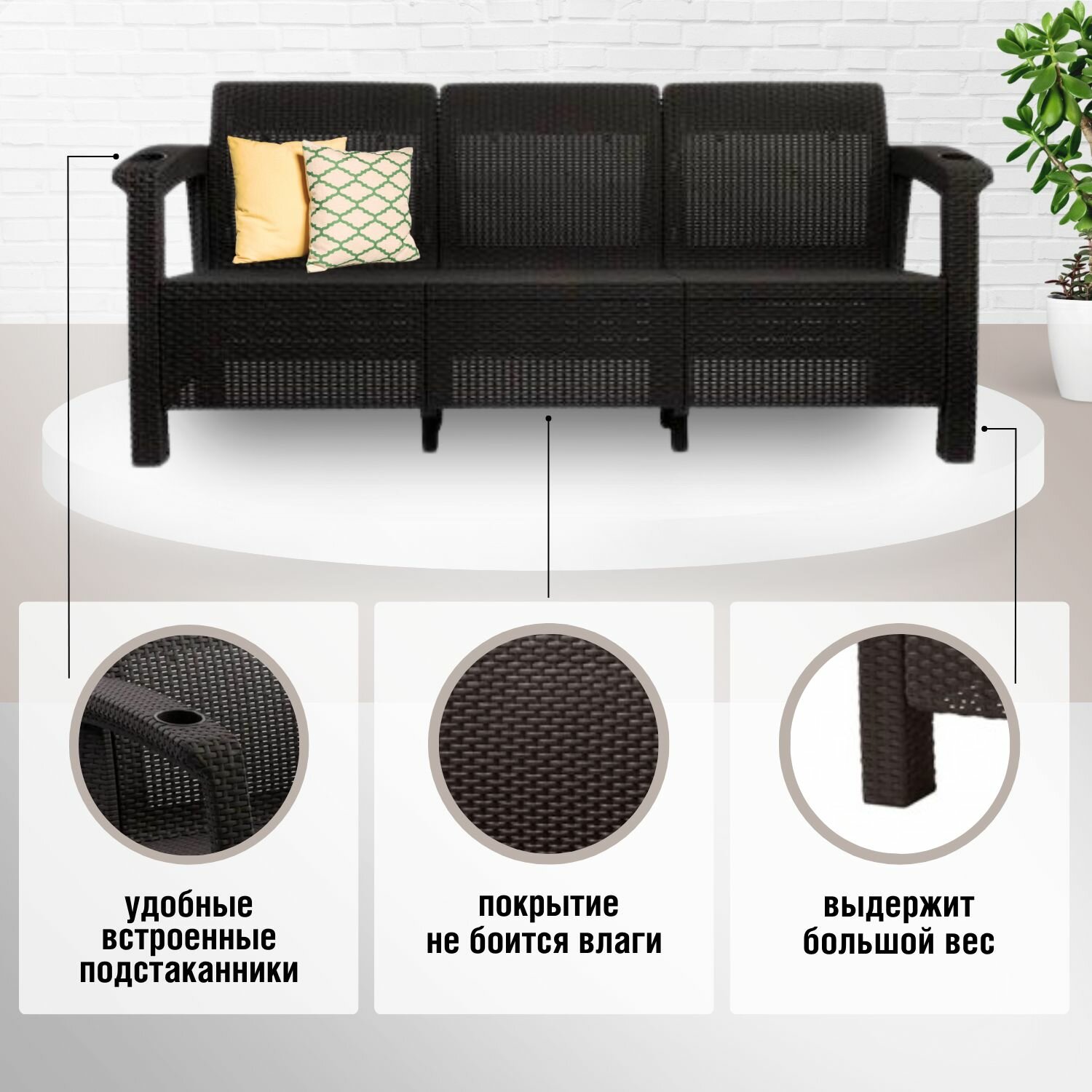 Садовая мебель. Комплект Фазенда-3 трехместный диван и обеденный стол, искуственный ротанг, мокко, черные подушки