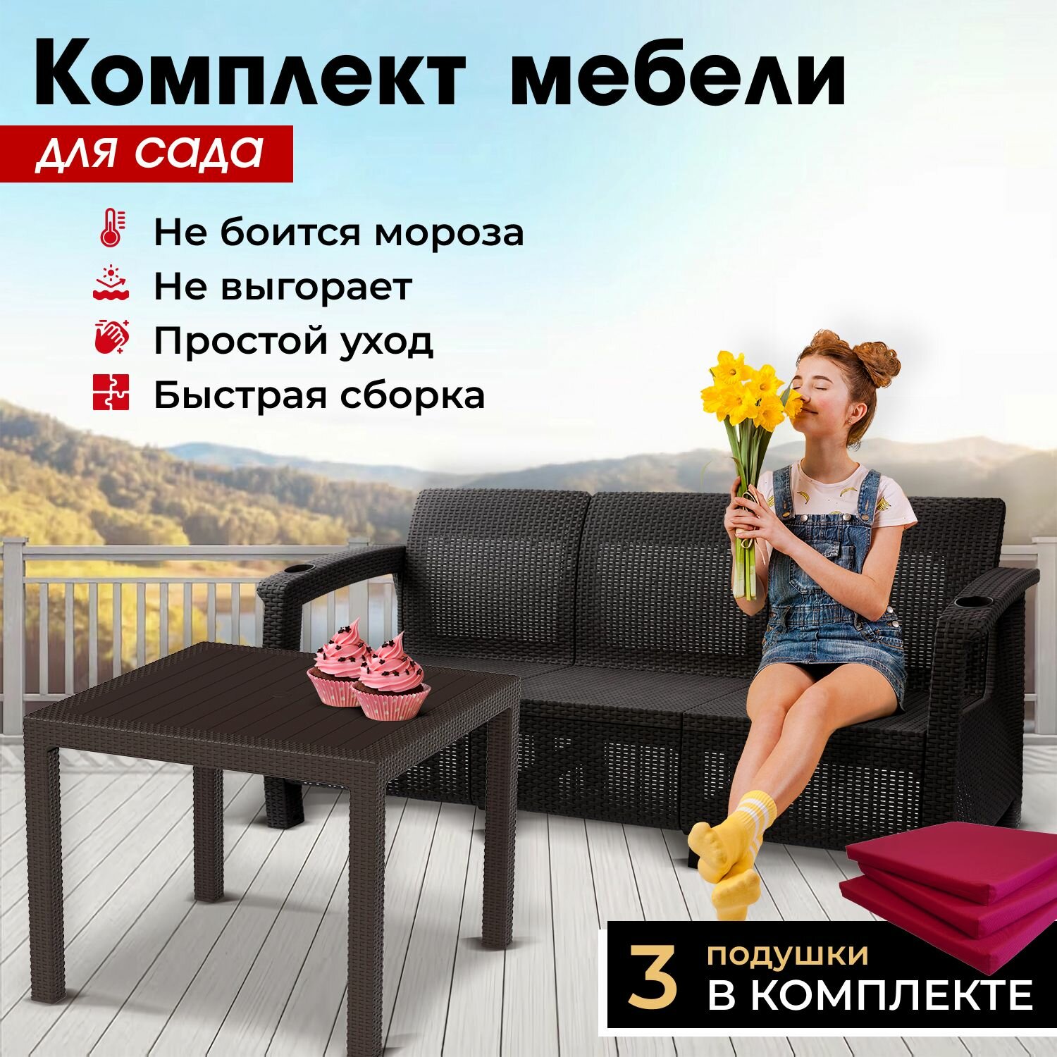Комплект садовой мебели HomlyGreen (3-х местный диван + Стол 94х94х74см.), искуственный ротанг, мокко, бордовые подушки информация: