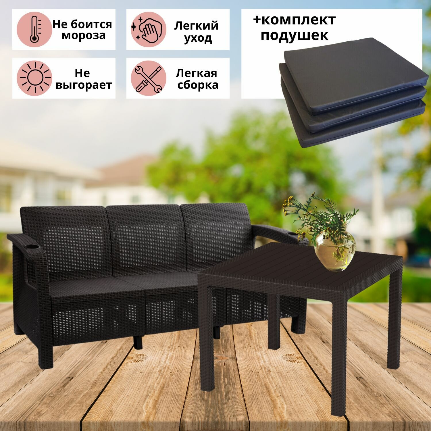 10 цен на Садовая мебель. Комплект Фазенда-3 трехместный диван и обеденный стол, мокко, черные подушки