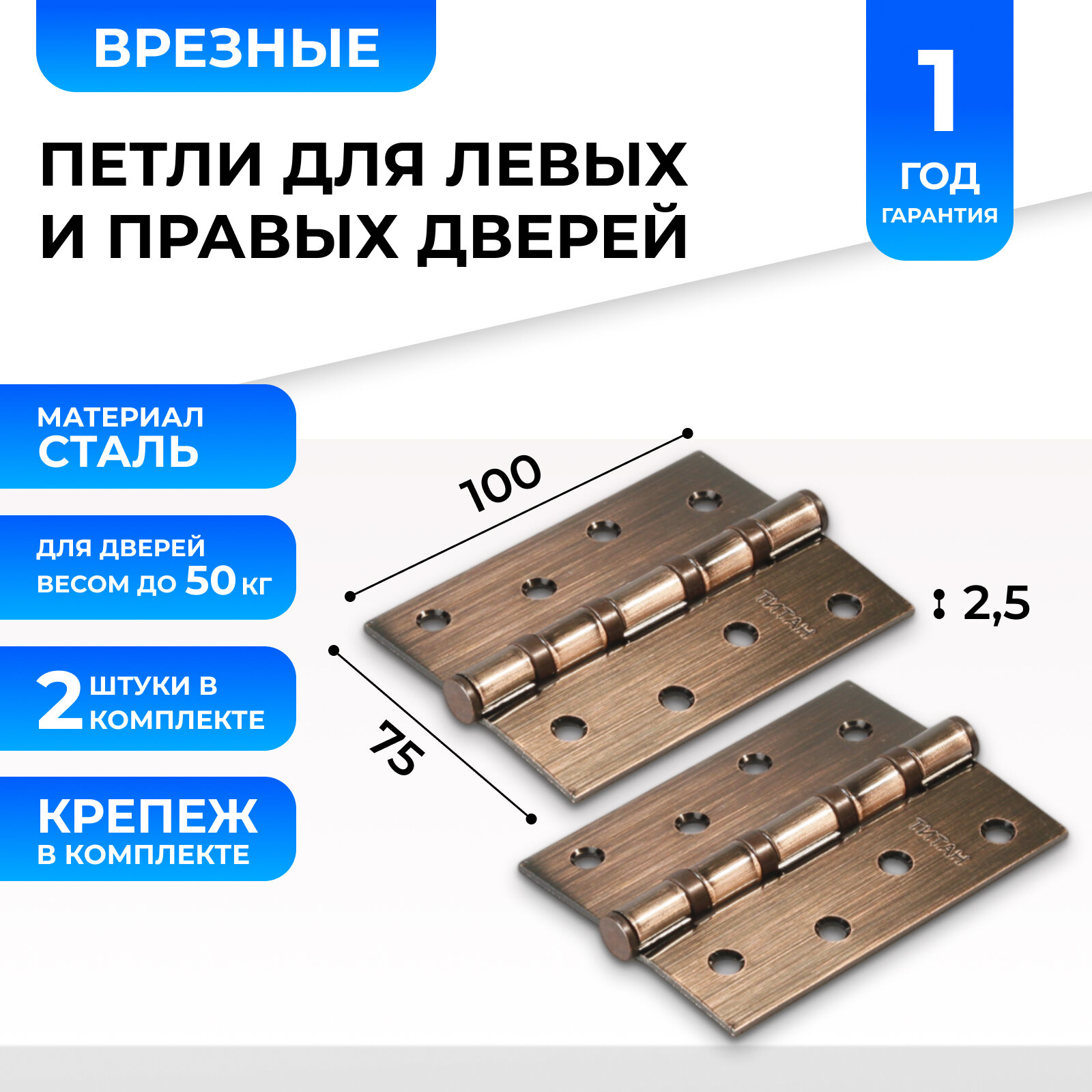 Отзывы на Петли дверные (2 шт) Титан 100х70х2.5 мм врезные универсальные AC Античная медь