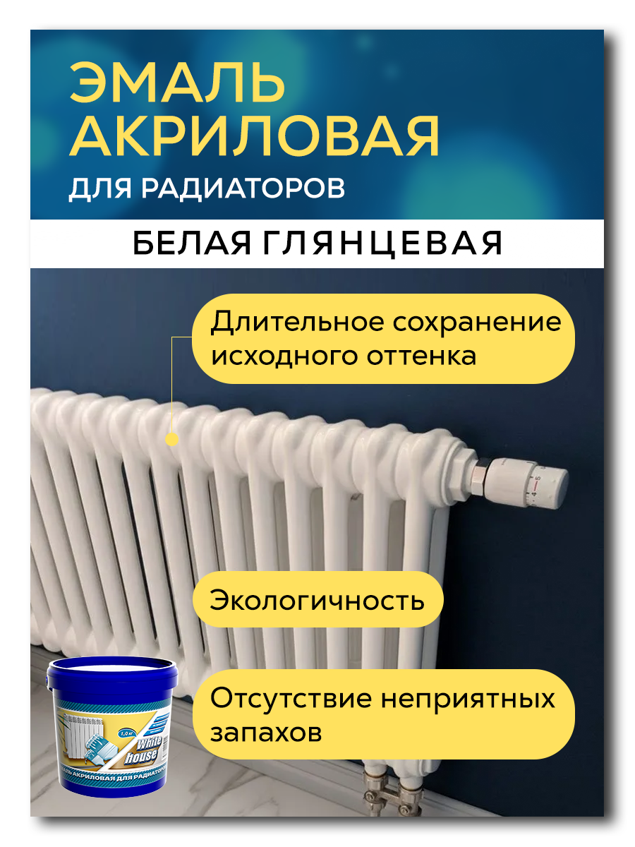 10 цен на Термостойкая краска-эмаль WHITE HOUSE для радиаторов отопления, батарей и труб , белая глянцевая, 0,5 кг