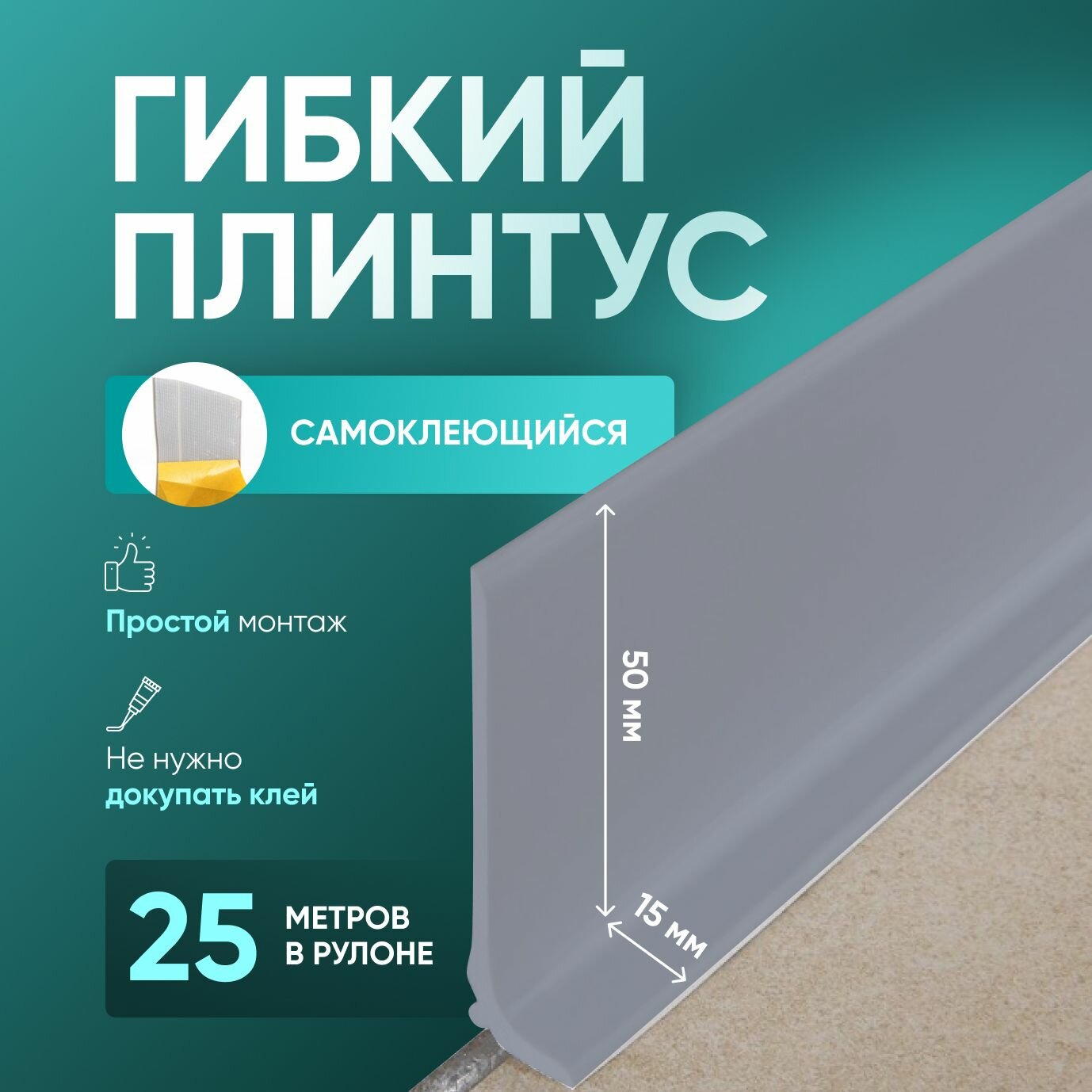 Плинтус гибкий напольный самоклеящийся, 25000х65 мм, 1 шт, светло-серый информация: