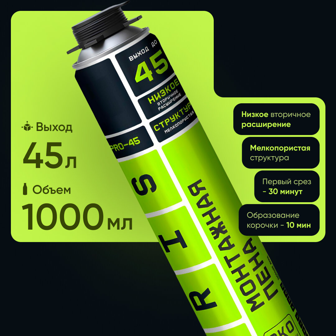 Профессиональная монтажная пена PRO-45 Всесезонная / с выходом до 45 литров готового продукта , TRIS 1000 мл. информация: