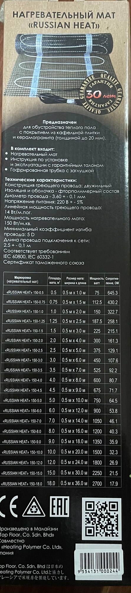 Теплый Пол Russian Heat Нагревательный мат двухжильный 3м2 , 150вт/м2, 600х50 см информация: