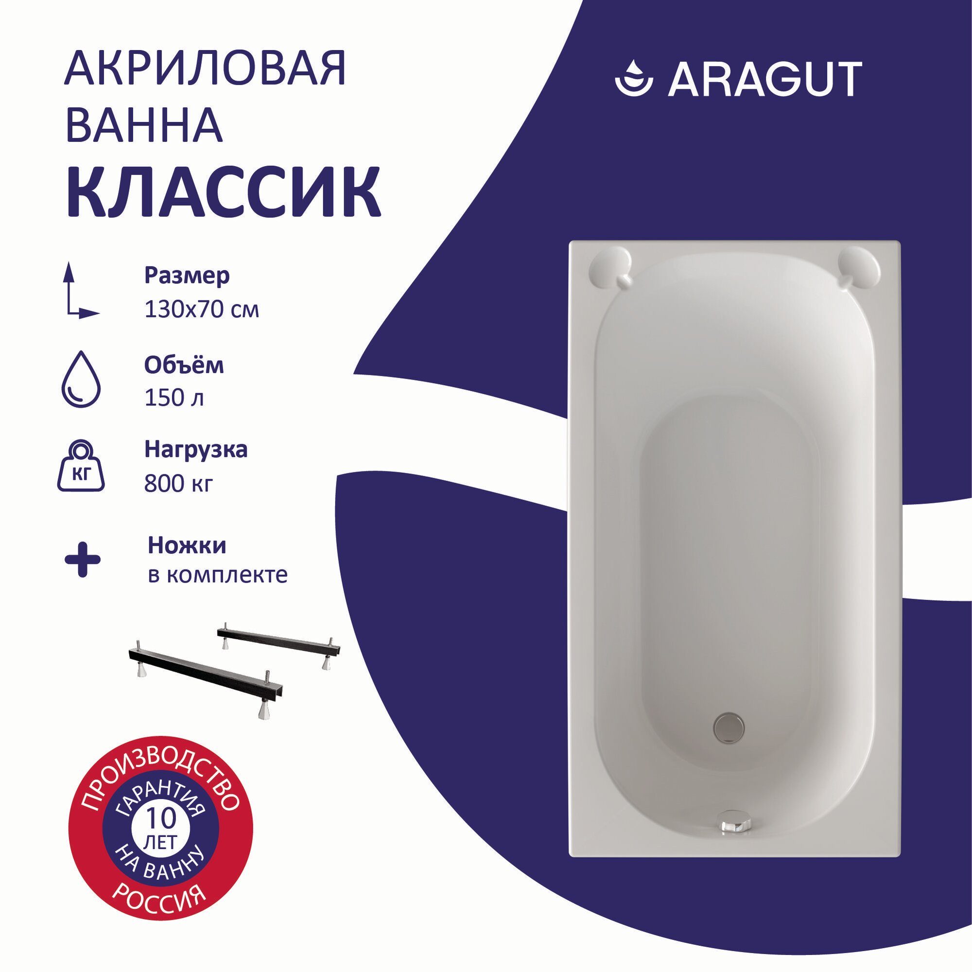 10 цен на Акриловая ванна ARAGUT Классик 130х70 в комплекте с ножками