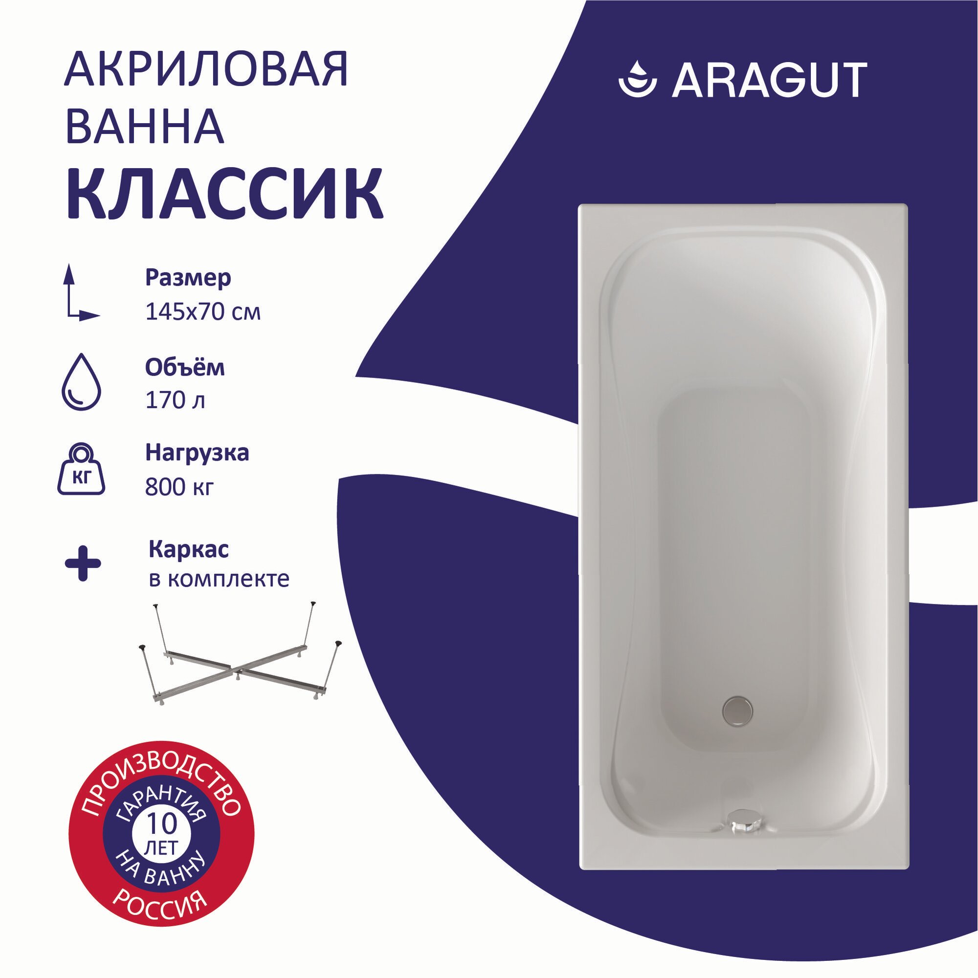 Акриловая ванна ARAGUT Классик 145х70 в комплекте с каркасом информация: