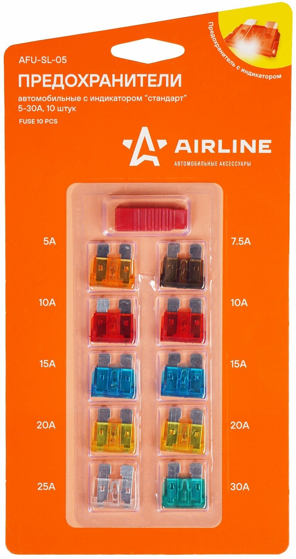 Предохранители "стандарт" с индикатором в блистере с экстрактором AIRLINE AFUSL05 (10 шт. 5-30А) (AFU-SL-05) - 1уп.