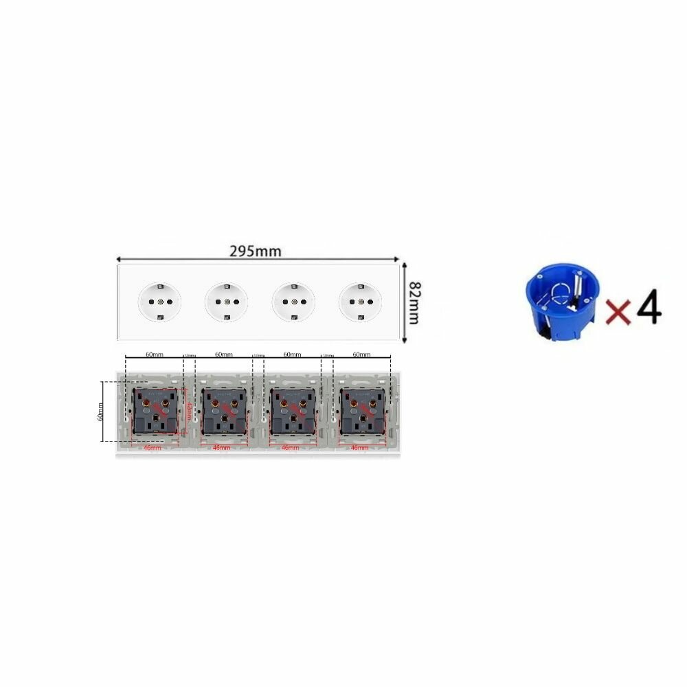 Розетка электрическая 4 поста 16А, рамка 295*82*35mm. рамка стекло сплошное, цвет белый информация: