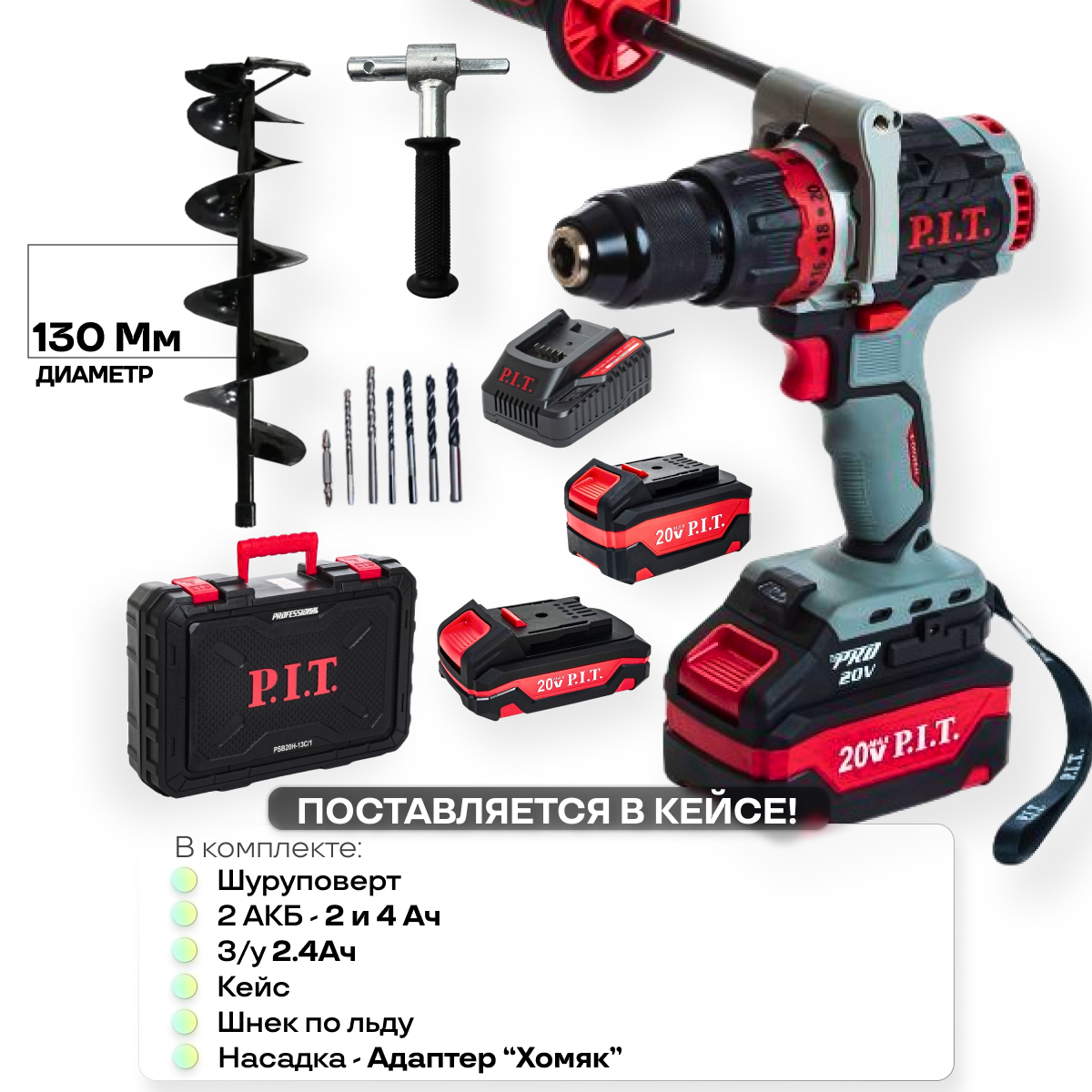 Шуруповерт для зимней рыбалки аккумуляторный бесщеточный PSB20H-13C/1 P.I.T, кейс, З/У, АКБ 4Ач + адаптер для ледобура + шнек по льду 130 мм 22 290 ₽