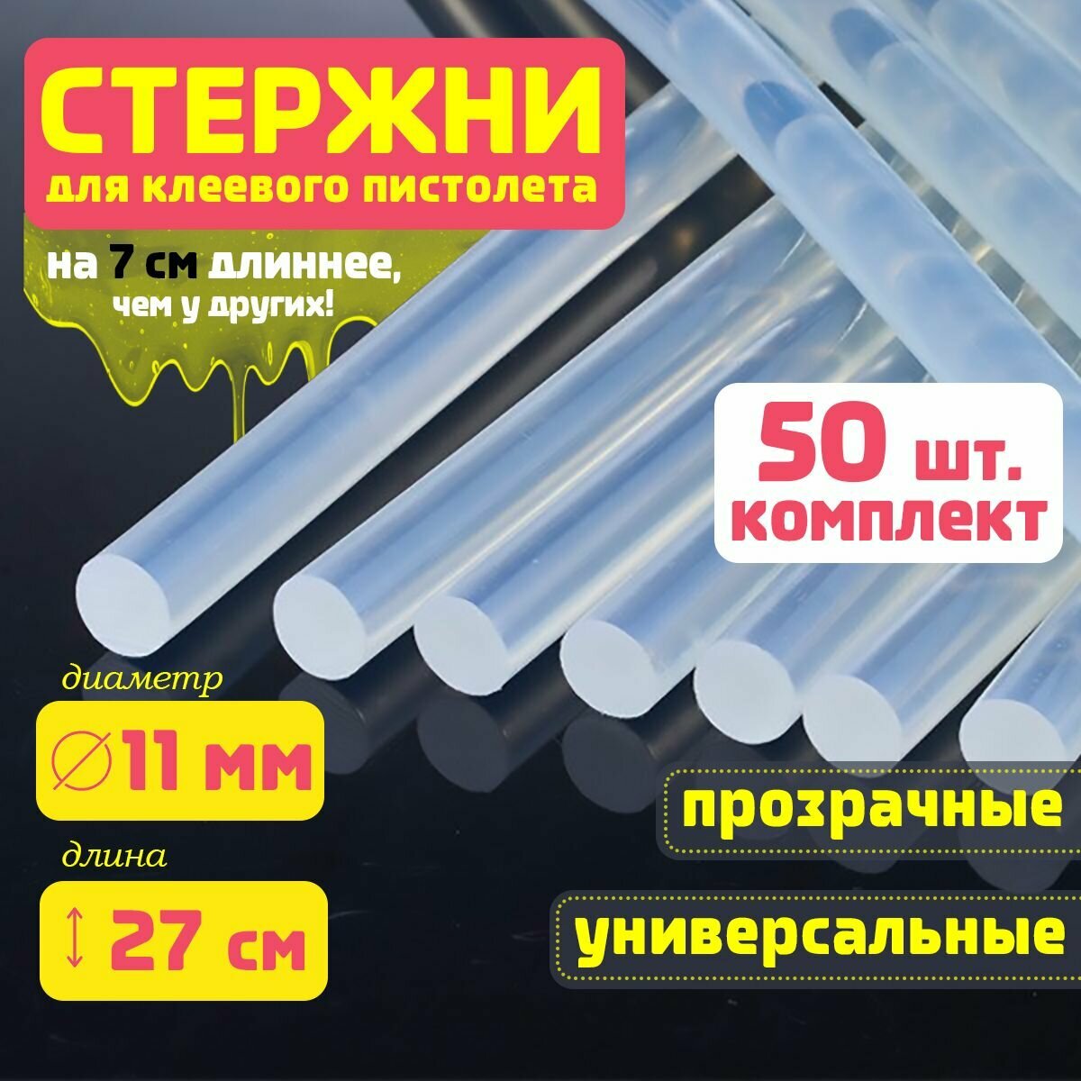 Клеевые стержни для клеевого пистолета 11 мм х 270 мм, термоклей, прозрачные 50 штук. информация: