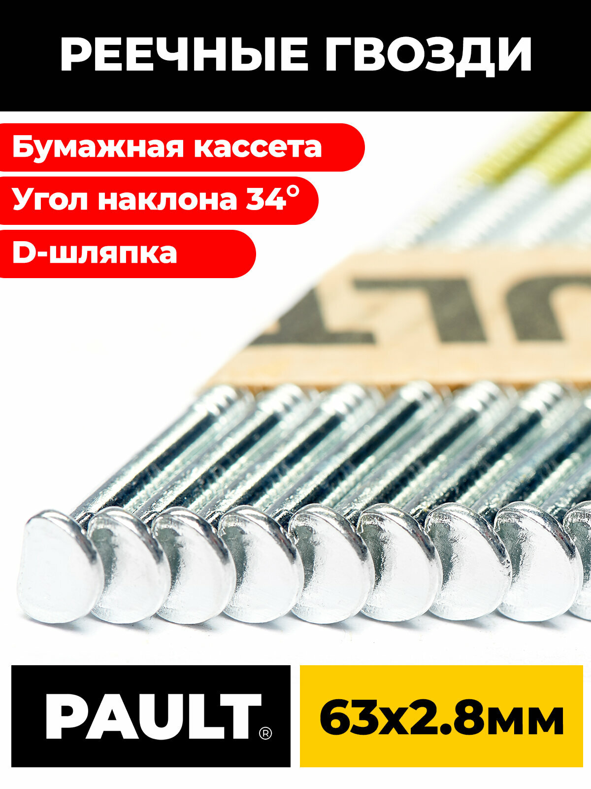 Отзывы на Реечные гвозди 3.1x 63 мм по дереву на бумажной кассете тип D34, кольц. накатка, гальванизация