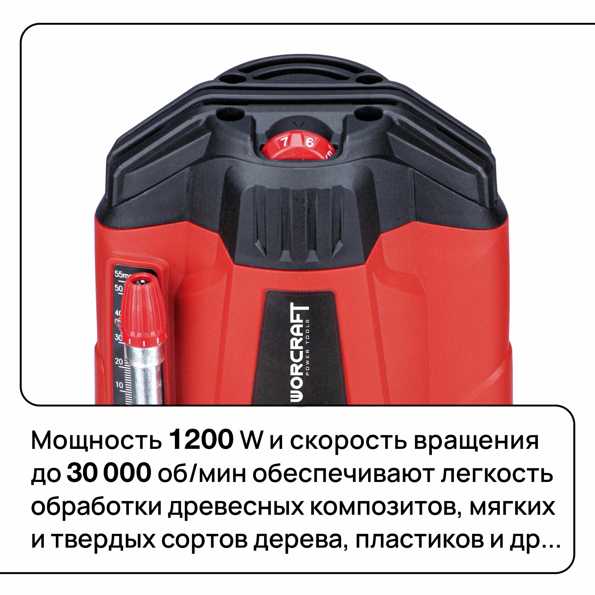 WORCRAFT Фрезер по дереву электрический, кромочный 1200 Вт, 30000 об/мин. Регулировка глубины строгания. информация: