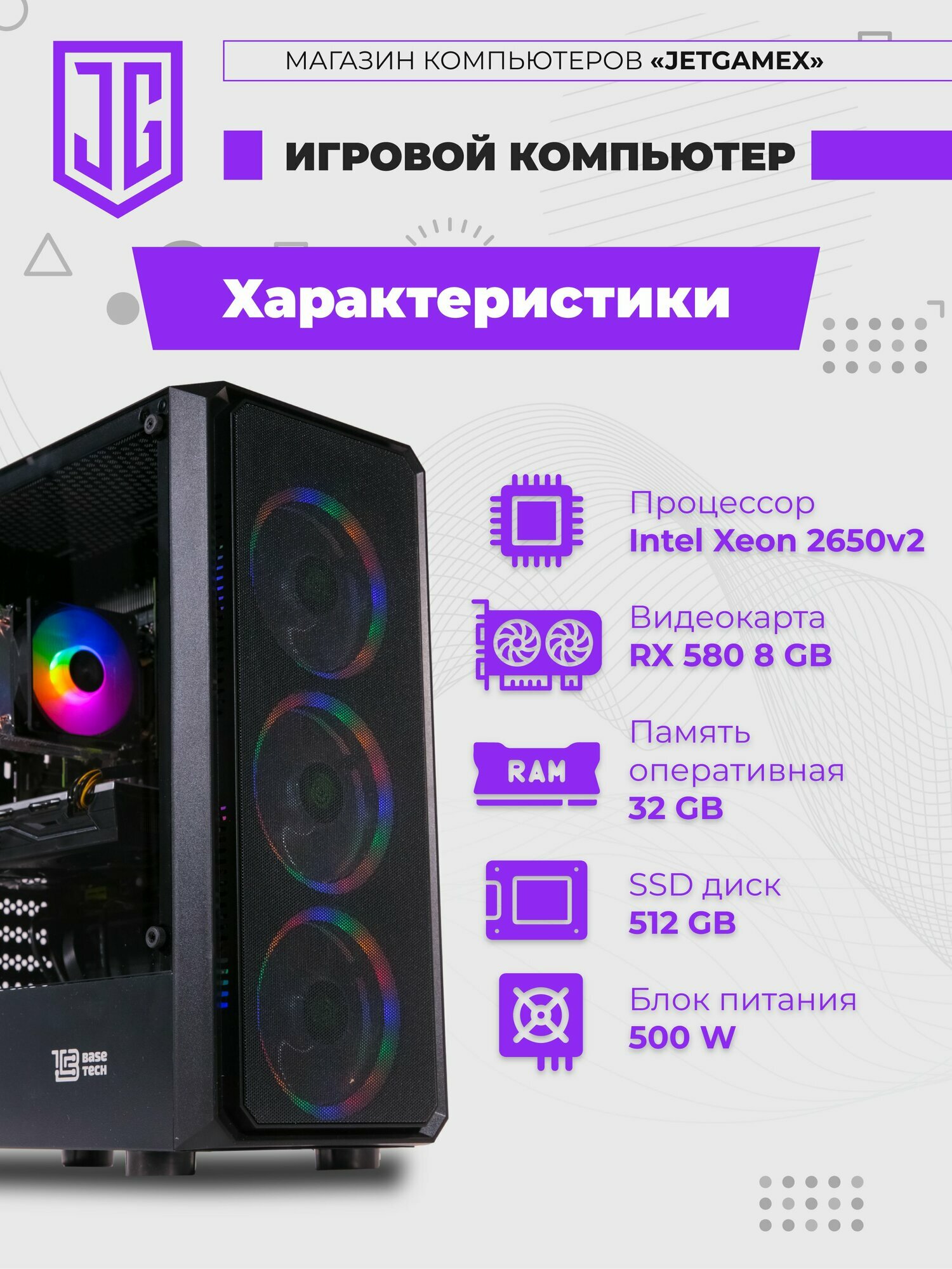 Системный блок, игровой компьютер JetGameX (Intel Xeon E5-2650V2 (2.6 ГГц), RAM 32 ГБ, SSD 512 ГБ, AMD Radeon RX 580 (8 Гб), Windows 10 Pro), черный информация: