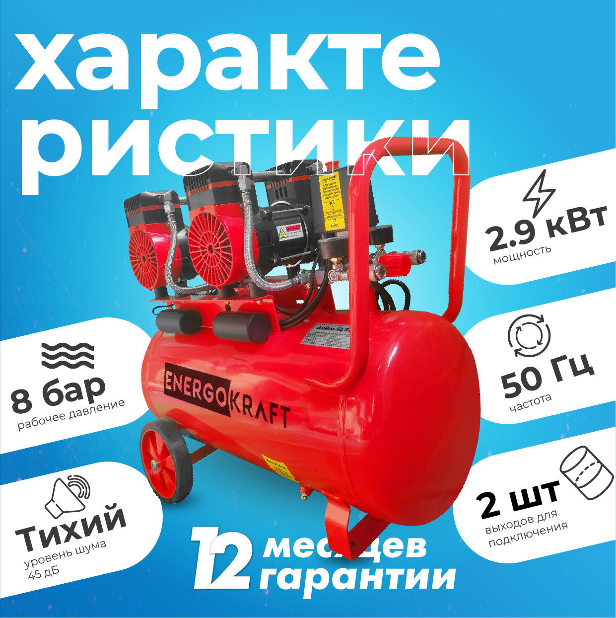 Воздушный компрессор ENERGOKRAFT AIRMAX 50/520, безмасляный ( ресивер 50 литров 520 л/мин) 4 цилиндра, поршневой, пневматический информация: