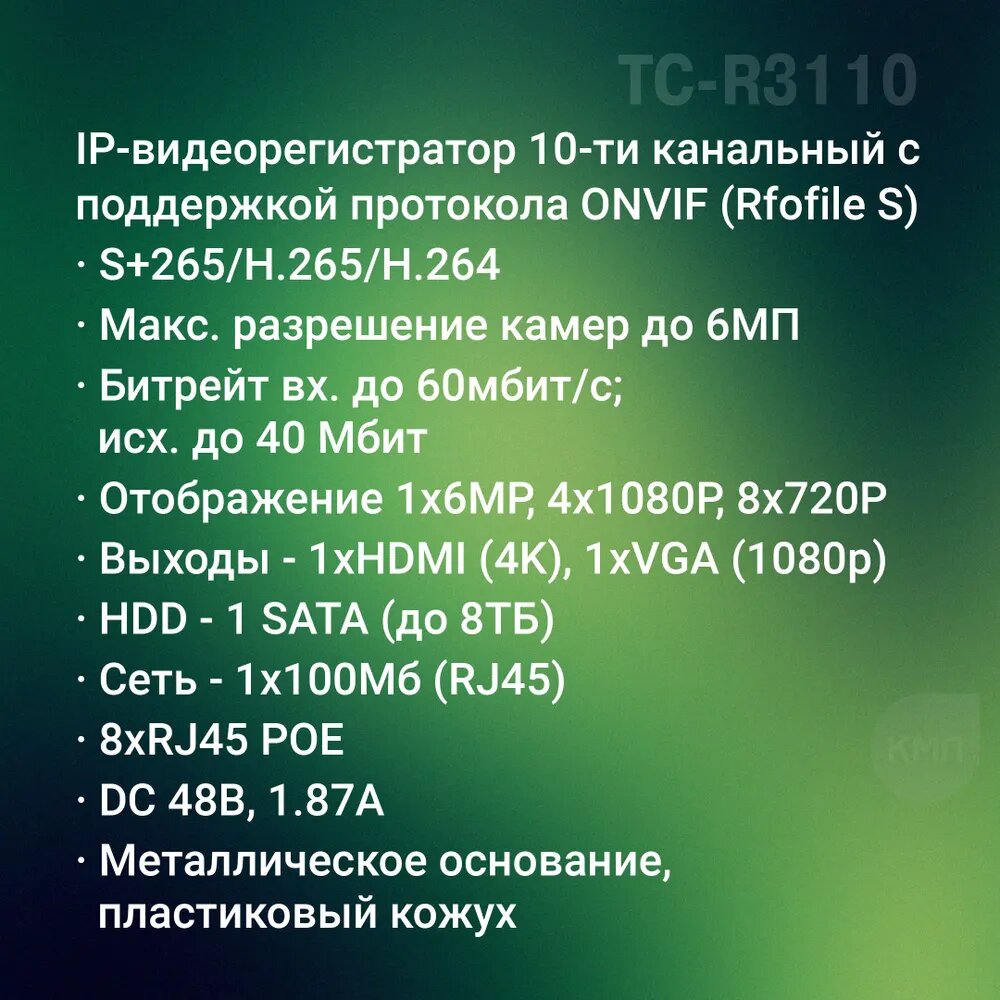 10 цен на Видеорегистратор сетевой 10-канальный 6Мп на 1 HDD, c PoE коммутатором Tiandy TC-R3110 Spec: I/B/P8/L/S