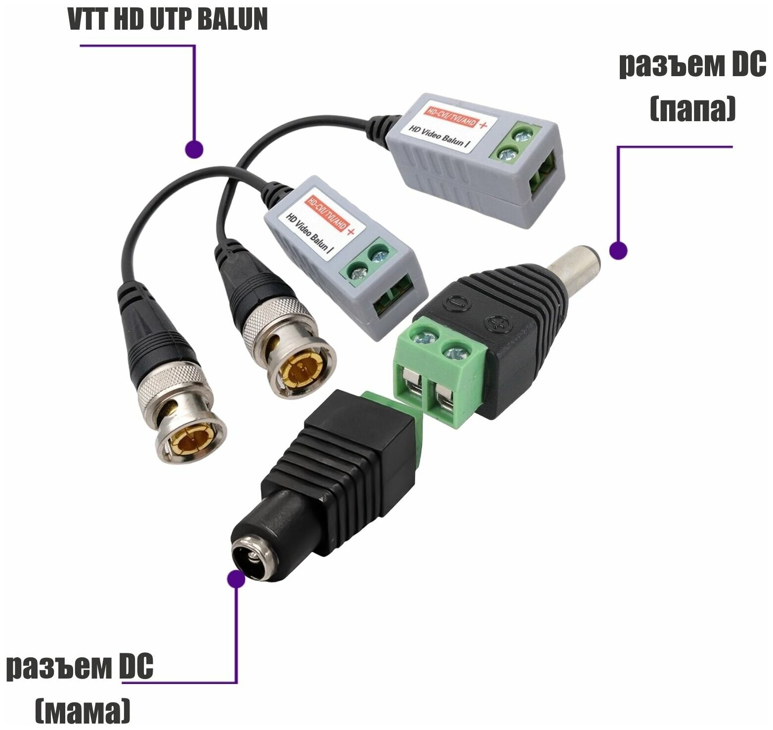 Комплект VTT HD UTP BALUN приемо-передатчики по витой паре AHD/CVI/TVI 4 шт. с переходниками DC (папа) и DC (мама) с клеммными колодками, по 2 шт. информация: