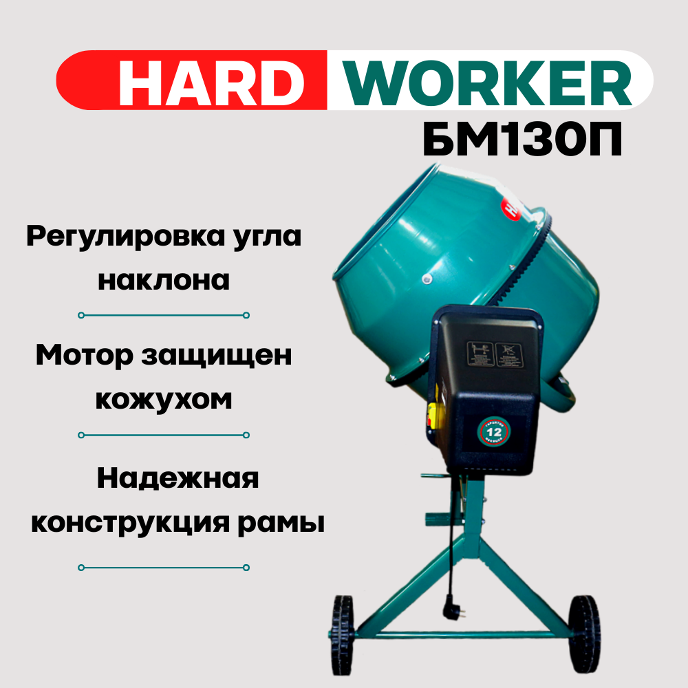 Бетоносмеситель/бетономешалка HARD WORKER БМ130П полиамидный венец, объем 130 литров, мощность 550 Вт информация: