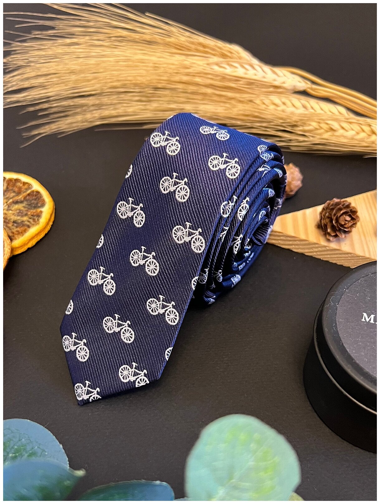 | Подробная комплектация | Галстук для мужчины узкий темно-синий с велосипедами - 1 шт. |