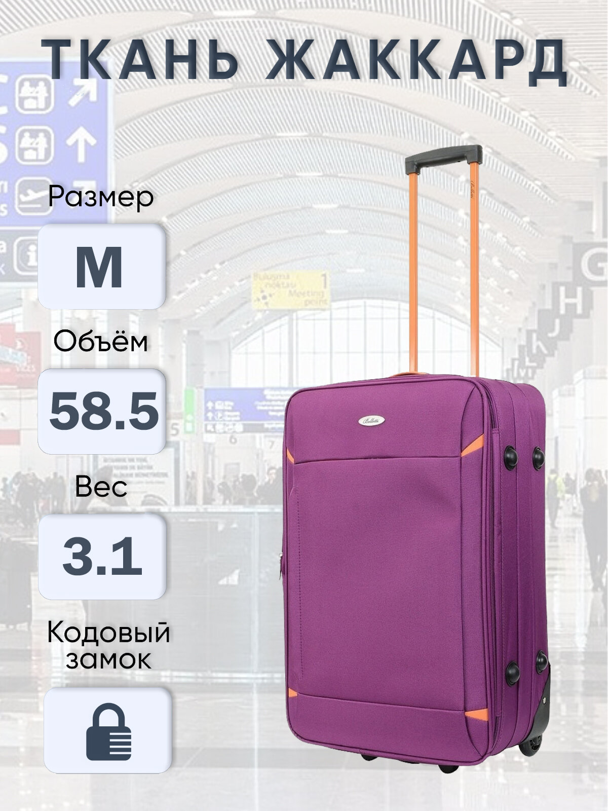Чемодан на колесах BELLETTI 302-65см (фиолетовый/оранжевый) M, 58,5 л информация:
