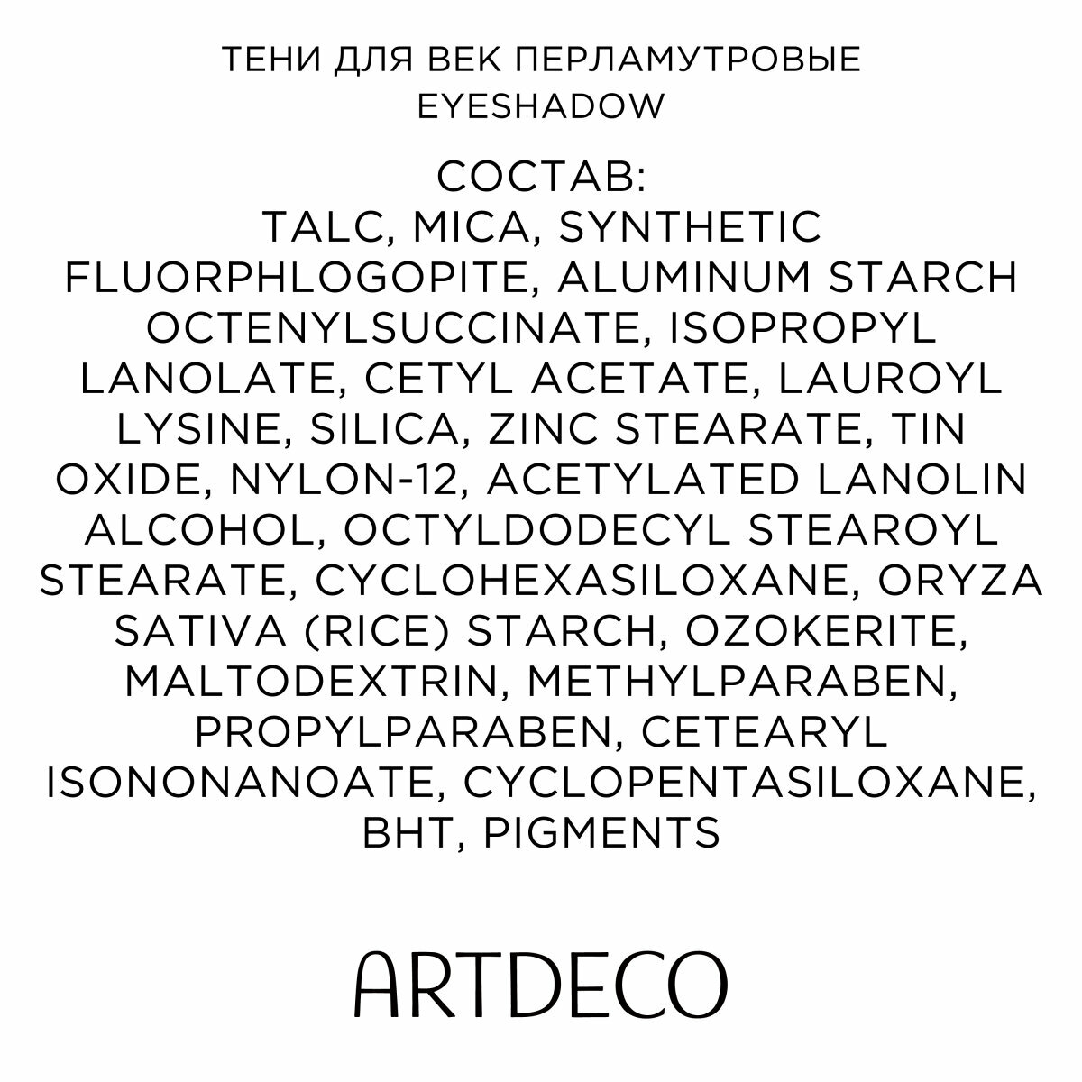 | Способ применения | перламутровые тени для век Eyeshadow Pearl от ARTDECO наносятся на чистую кожу век, используя аппликатор или кисть. Для получения наилучшего результата используйте базу (праймер) под тени |
