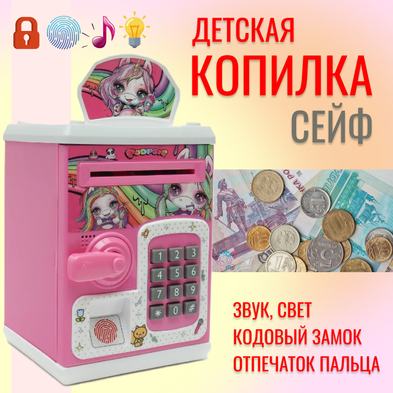 10 цен на Детская интерактивная копилка-сейф для денег Единорог, розовая / Копилки для мальчиков и девочек / Кодовый замок / Купюроприемник