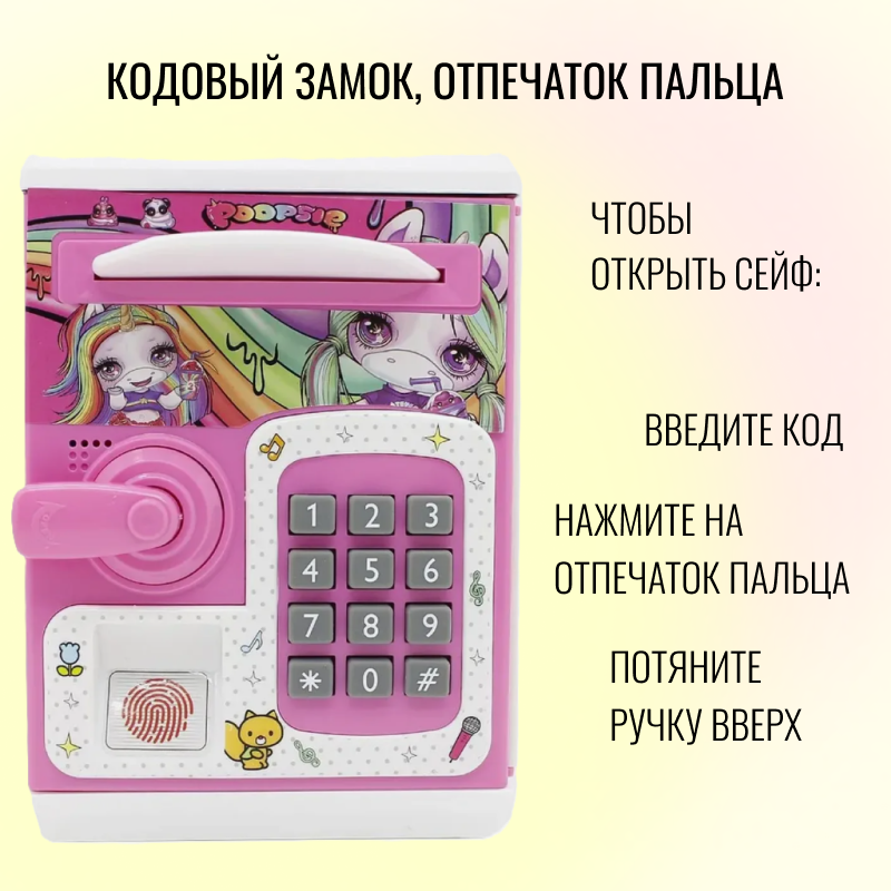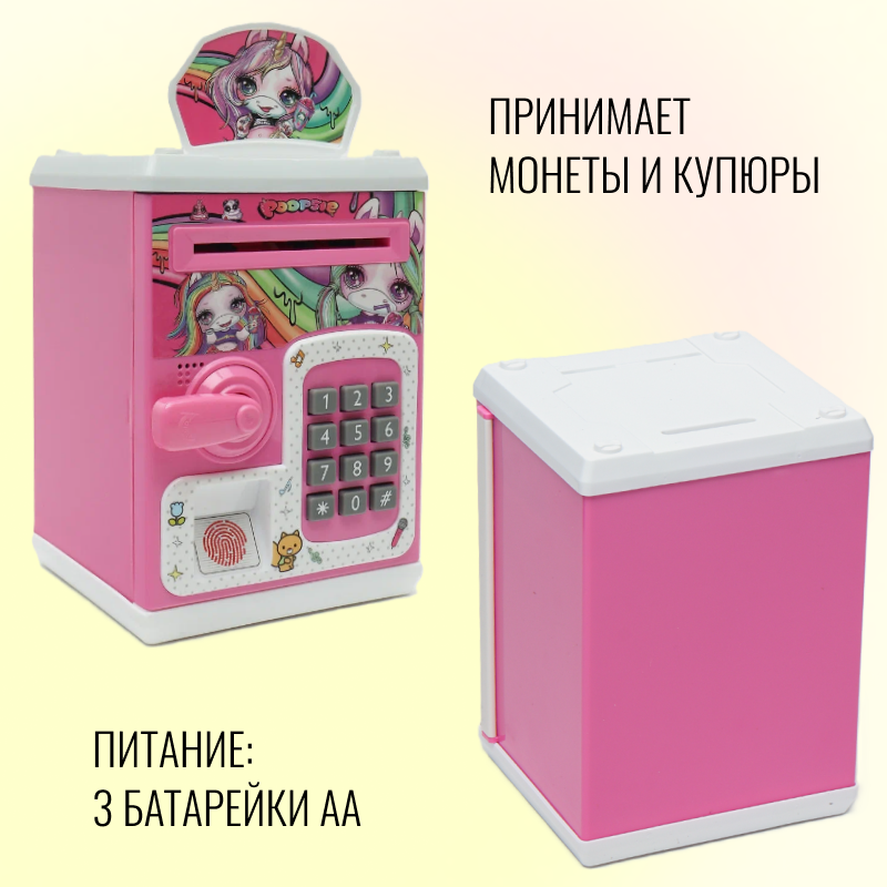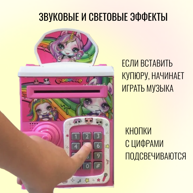 Детская интерактивная копилка-сейф для денег Единорог, розовая / Копилки для мальчиков и девочек / Кодовый замок / Купюроприемник информация: