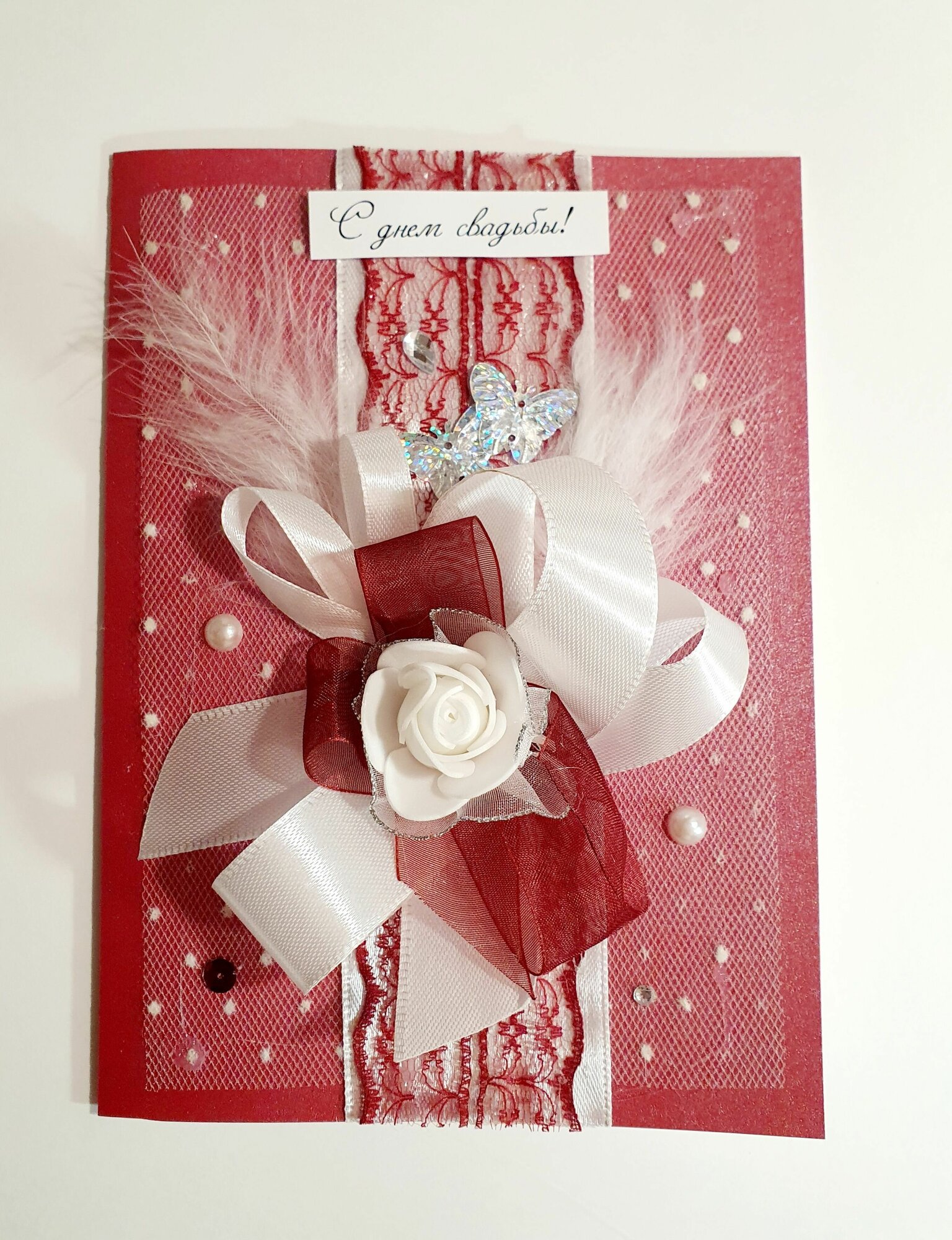 10 цен на Открытка ручной работы "С днем свадьбы!", бордовая.+Конверт и конверт для денег.