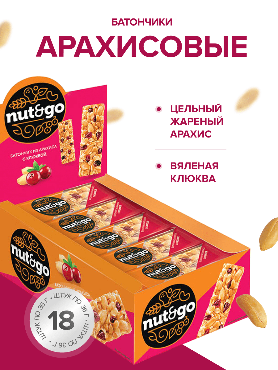 Батончик Nut&Go с арахисом и клюквой, 42 г (упаковка 18 шт информация: