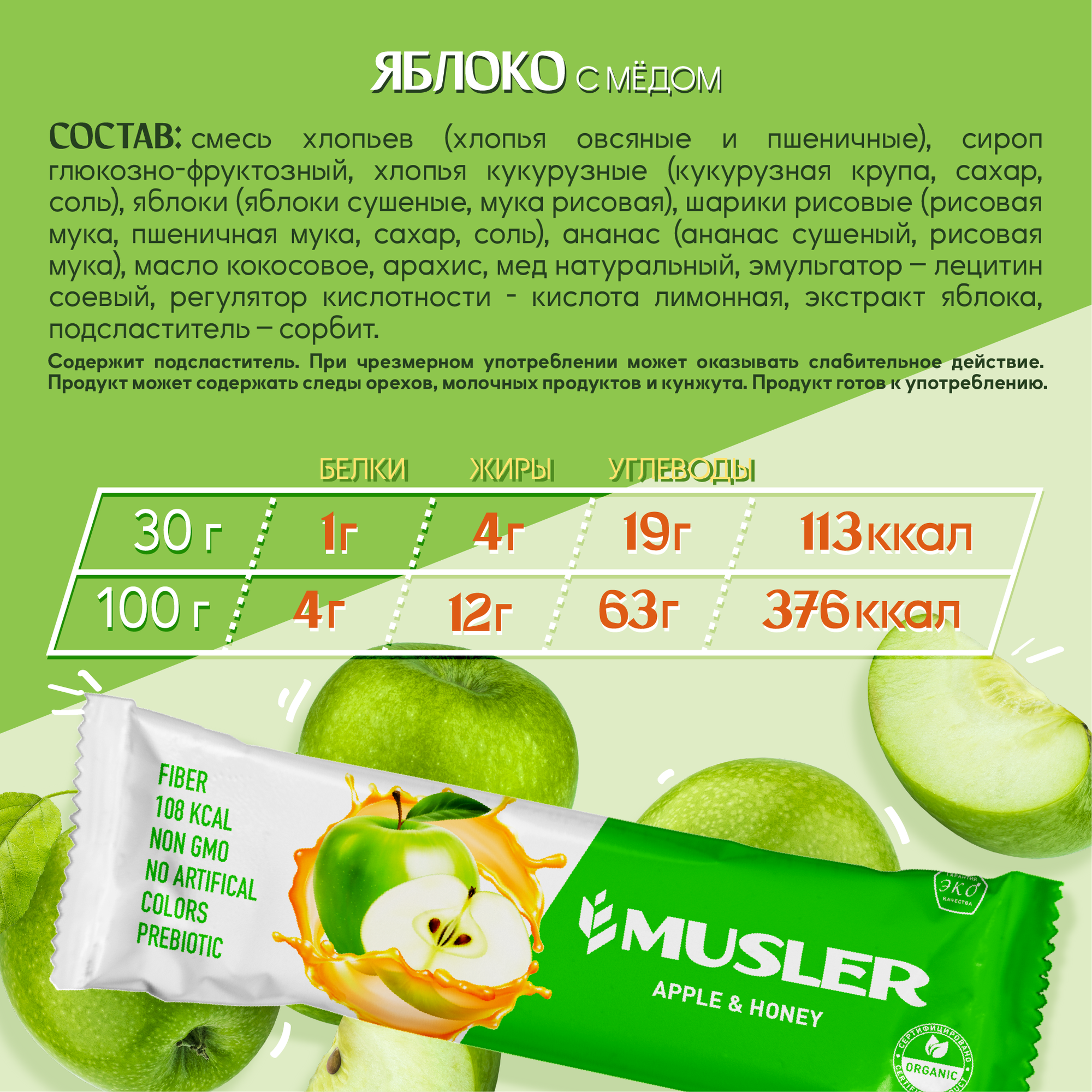 Злаковые батончики мюсли Musler Яблоко и мед 30г (25шт) информация: